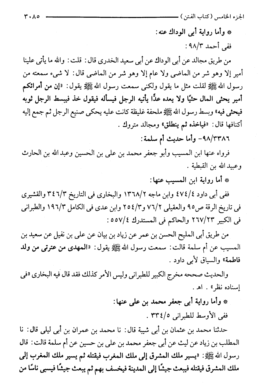 من طريق أبي المليح الحسن بن عمر عن زياد بن بيان عن على بن نفيل عن سعيد بن المسيب عن أم سلمة قالت: سمعت رسول اللَّه - صلى اللَّه عليه وسلم - يقول: "المهدى من عترتى من ولد فاطمة" والسياق لأبى داود.
