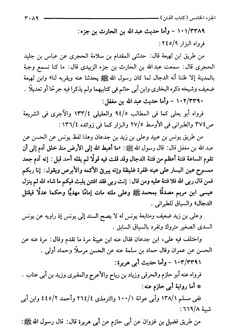 من طريق ابن لهيعة قال: حدثنى المقدام بن سلامة الحجرى عن عباس بن جليد الحجرى قال: سمعت عبد اللَّه بن الحارث بن جزء الزبيدى قال: ما كنا نسمع وجبة بالمدينة إلا ظننا أنه الدجال لما كان رسول اللَّه - صلى اللَّه عليه وسلم - يحدثنا عنه ويقربه لنا" وابن لهيعة ضعيف وشيخه ذكره البخاري وابن أبي حاتم في كتابيهما ولم يذكرا فيه جرحًا أو تعديلًا.