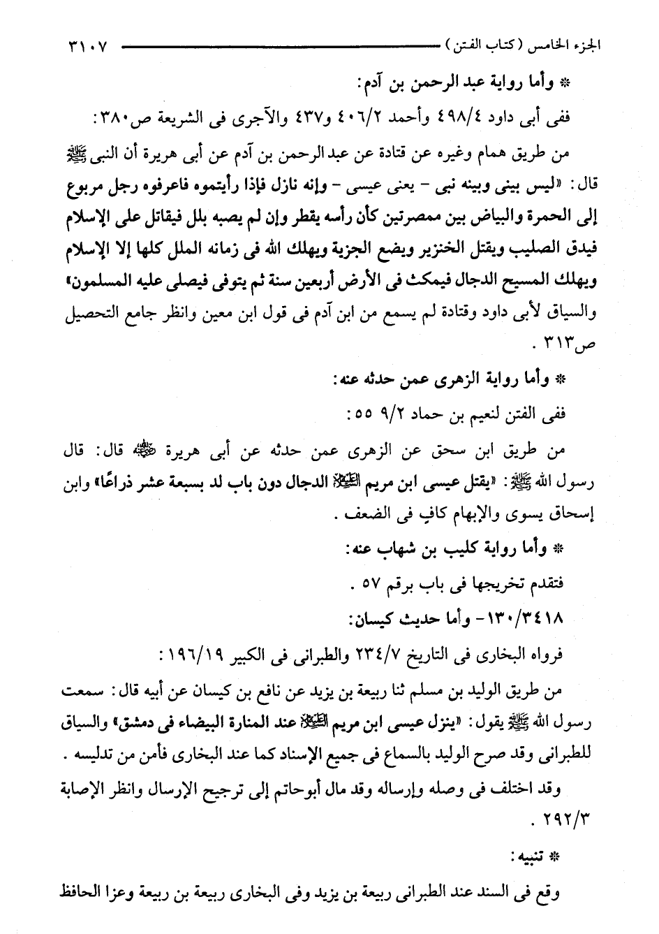 من طريق همام وغيره عن قتادة عن عبد الرحمن بن آدم عن أبي هريرة أن النبي - صلى اللَّه عليه وسلم - قال: "ليس بينى وبينه نبي -يعنى عيسى- وإنه نازل فإذا رأيتموه فاعرفوه رجل مربوع إلى الحمرة والبياض بين ممصرتين كأن رأسه يقطر وإن لم يصبه بلل فيقاتل على الإسلام فيدق الصليب ويقتل الخنزير ويضع الجزية ويهلك اللَّه في زمانه الملل كلها إلا الإسلام ويهلك المسيح الدجال فيمكث في الأرض أربعين سنة ثم يتوفى فيصلى عليه المسلمون" والسياق لأبى داود وقتادة لم يسمع من ابن آدم في قول ابن معين وانظر جامع التحصيل ص 313.