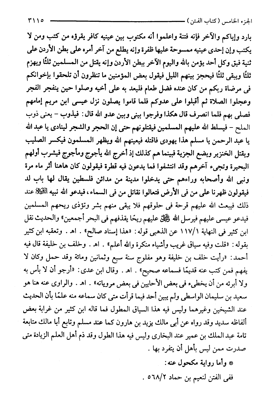 بارد وإياكم والآخر فإنه فتنة واعلموا أنه مكتوب بين عينيه كافر يقرؤه من كتب ومن لا يكتب وإن إحدى عينيه ممسوحة عليها ظفرة وإنه يطلع من آخر أمره على بطن الأردن على ثنية فيق وكل أحد يؤمن باللَّه واليوم الآخر ببطن الأردن وإنه يقتل من المسلمين ثلثًا ويهزم ثلثًا ويبقى ثلثًا فيحجز بينهم الليل فيقول بعض المؤمنين ما تنظرون أن تلحقوا بإخوانكم في مرضاة ربكم من كان عنده فضل طعام فليعد به على أخيه وصلوا حين ينفجر الفجر وعجلوا الصلاة ثم أقبلوا على عدوكم فلما قاموا يصلون نزل عيسى ابن مريم إمامهم فصلى بهم فلما انصرف قال هكذا وفرجوا بينى وبين عدو اللَّه قال: فيذوب -يعنى ذوب الملح- فيسلط اللَّه عليهم المسلمين فيقتلونهم حتى إن الحجر والشجر لينادى يا عبد اللَّه يا عبد الرحمن يا مسلم هذا يهودى فاقتله فيعينهم اللَّه ويظهر المسلمون فيكسر الصليب ويقتل الخنزير ويضع الجزية فبينما هم كذلك إذ أخرج اللَّه يأجوج ومأجوج فيشرب أولهم البحيرة وتجىء آخرهم وقد انتشفوا فما يدعون فيه قطرة فيقولون كان هاهنا أثر ماء مرة ونبى اللَّه وأصحابه وراءهم حتى يدخلوا مدينة من مدائن فلسطين يقال لها باب لد فيقولون ظهرنا على من في الأرض فتعالوا نقاتل من في السماء، فيدعو اللَّه نبيه عليه السلام عند ذلك فيبعث اللَّه عليهم قرحة في حلوقهم فلا يبقى منهم بشر وتؤذى ريحهم المسلمين فيدعو عيسى عليهم فيرسل اللَّه -عَزَّ وَجَلَّ- عليهم ريحًا يقذفهم في البحر أجمعين" والحديث نقل ابن كثير في النهاية 1/ 117 عن الذهبى قوله: "هذا إسناد صالح" اهـ. وتعقبه ابن كثير بقوله: "قلت وفيه سياق غريب وأشياء منكرة واللَّه أعلم". اهـ. وخلف بن خليفة قال فيه أحمد: "رأيت خلف بن خليفة وهو مفلوج سنة سبع وثمانين ومائة وقد حمل وكان لا يفهم فمن كتب عنه قديمًا فسماعه صحيح". اهـ. وقال ابن عدى: "أرجو أن لا بأس به ولا أبرئه من أن يخطىء في بعض الأحايين في بعض مروياته". اهـ. والراوى عنه هنا هو سعيد بن سليمان الواسطى ولم يبين أحد فيما قرأت متى كان سماعه منه علمًا بأن الحديث عند الشيخين وغيرهما وليس فيه هذا السياق المطول فما قاله ابن كثير من غرابة بعض ألفاظه سديد وقد رواه عن أبي مالك يزيد بن هارون كما عند مسلم وتابع أبا مالك متابعة تامة عبد الملك بن عمير عند البخاري وليس فيه هذا الطول وقد ذم أهل العلم الزيادة متى صدرت ممن ليس بأهل أن يتفرد بها.