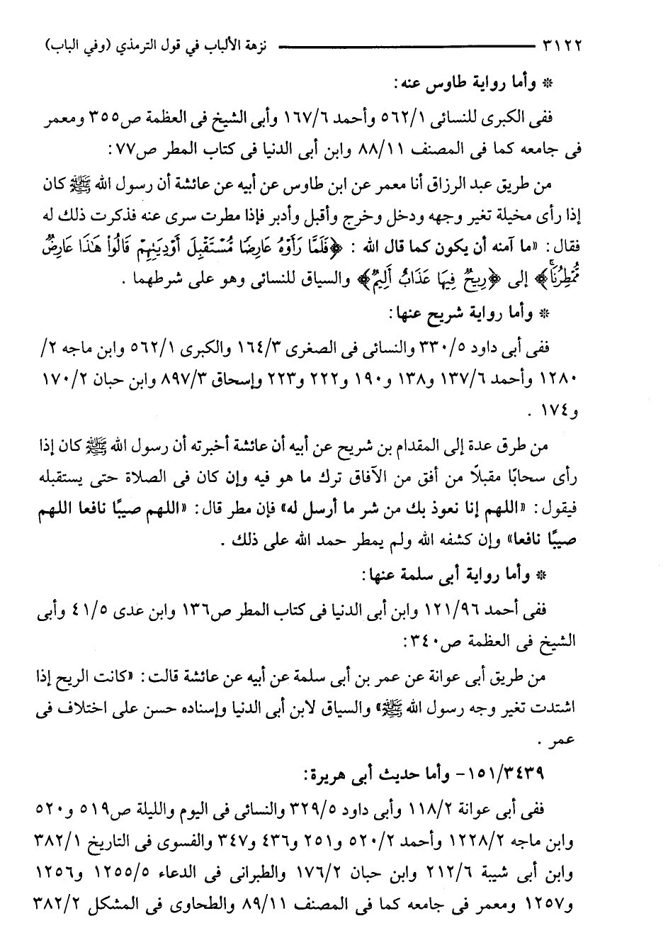 ففي الكبرى للنسائي 1/ 562 وأحمد 6/ 167 وأبي الشيخ في العظمة ص 355 ومعمر في جامعه كما في المصنف 11/ 88 وابن أبي الدنيا في كتاب المطر ص 77: