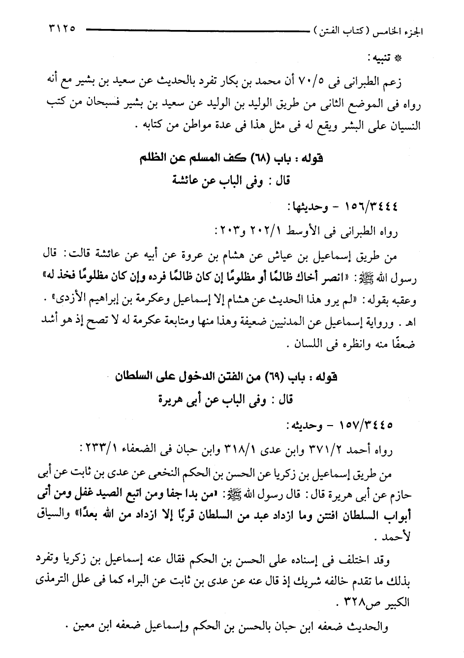 من طريق إسماعيل بن عياش عن هشام بن عروة عن أبيه عن عائشة قالت: قال رسول اللَّه - صلى اللَّه عليه وسلم -: "انصر أخاك ظالمًا أو مظلومًا إن كان ظالمًا فرده وإن كان مظلومًا فخذ له" وعقبه بقوله: "لم يرو هذا الحديث عن هشام إلا إسماعيل وعكرمة بن إبراهيم الأزدى". اهـ. ورواية إسماعيل عن المدنيين ضعيفة وهذا منها ومتابعة عكرمة له لا تصح إذ هو أشد ضعفًا منه وانظره في اللسان.