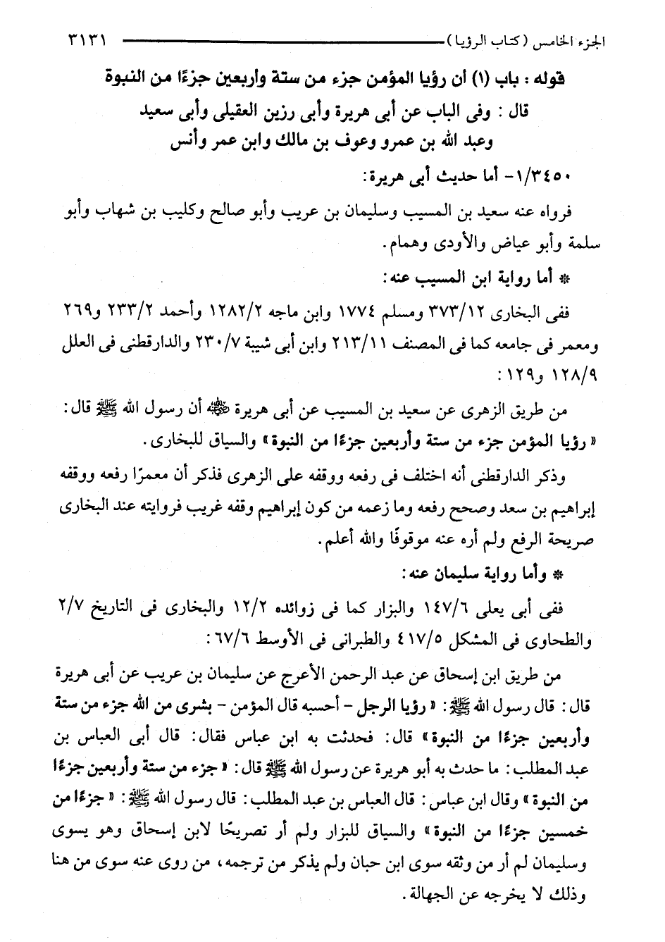 من طريق الزهرى عن سعيد بن المسيب عن أبي هريرة -رضي اللَّه عنه- أن رسول اللَّه - صلى اللَّه عليه وسلم - قال: "رؤيا المؤمن جزء من ستة وأربعين جزءًا من النبوة" والسياق للبخاري.