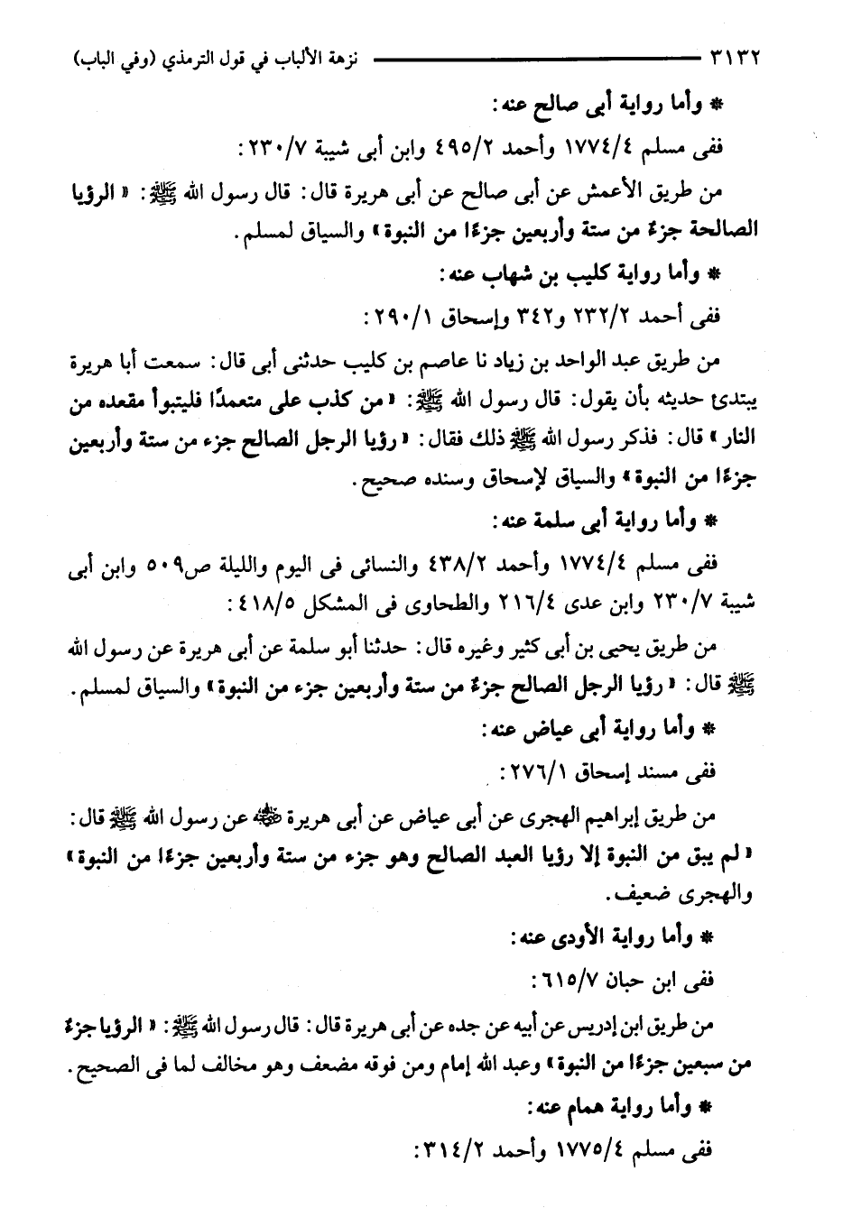 من طريق يحيى بن أبي كثير وغيره قال: حدثنا أبو سلمة عن أبي هريرة عن رسول اللَّه - صلى اللَّه عليه وسلم - قال: "رؤيا الرجل الصالح جزءٌ من ستة وأربعين جزء من النبوة" والسياق لمسلم.