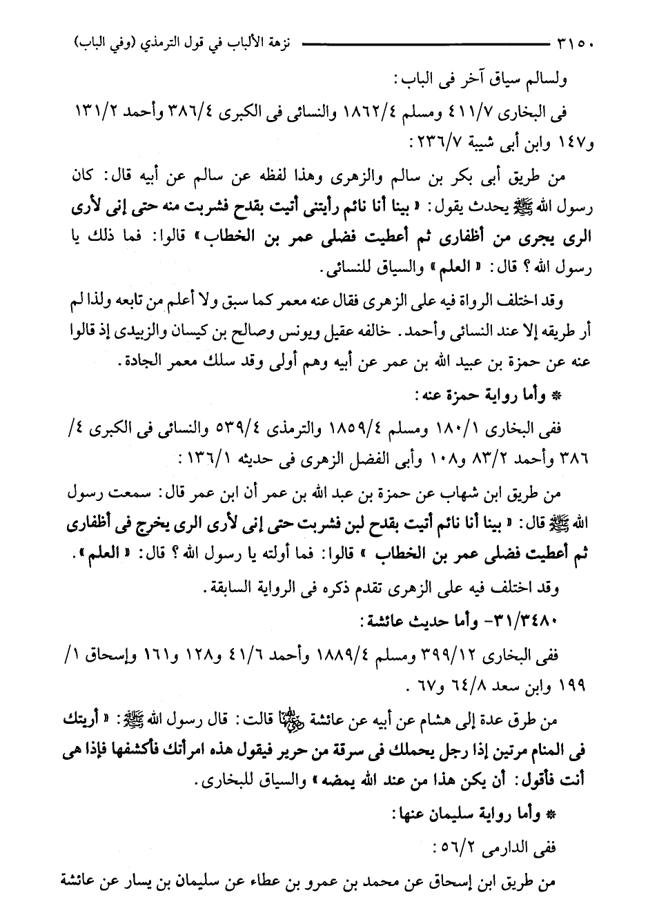 من طريق ابن شهاب عن حمزة بن عبد الله بن عمر أن ابن عمر قال: سمعت رسول الله - صلى الله عليه وسلم - قال: "بينا أنا نائم أتيت بقدح لبن فشربت حتى إنى لأرى الرى يخرج في أظفارى ثم أعطيت فضلى عمر بن الخطاب" قالوا: فما أولته يا رسول الله؟ قال: "العلم".