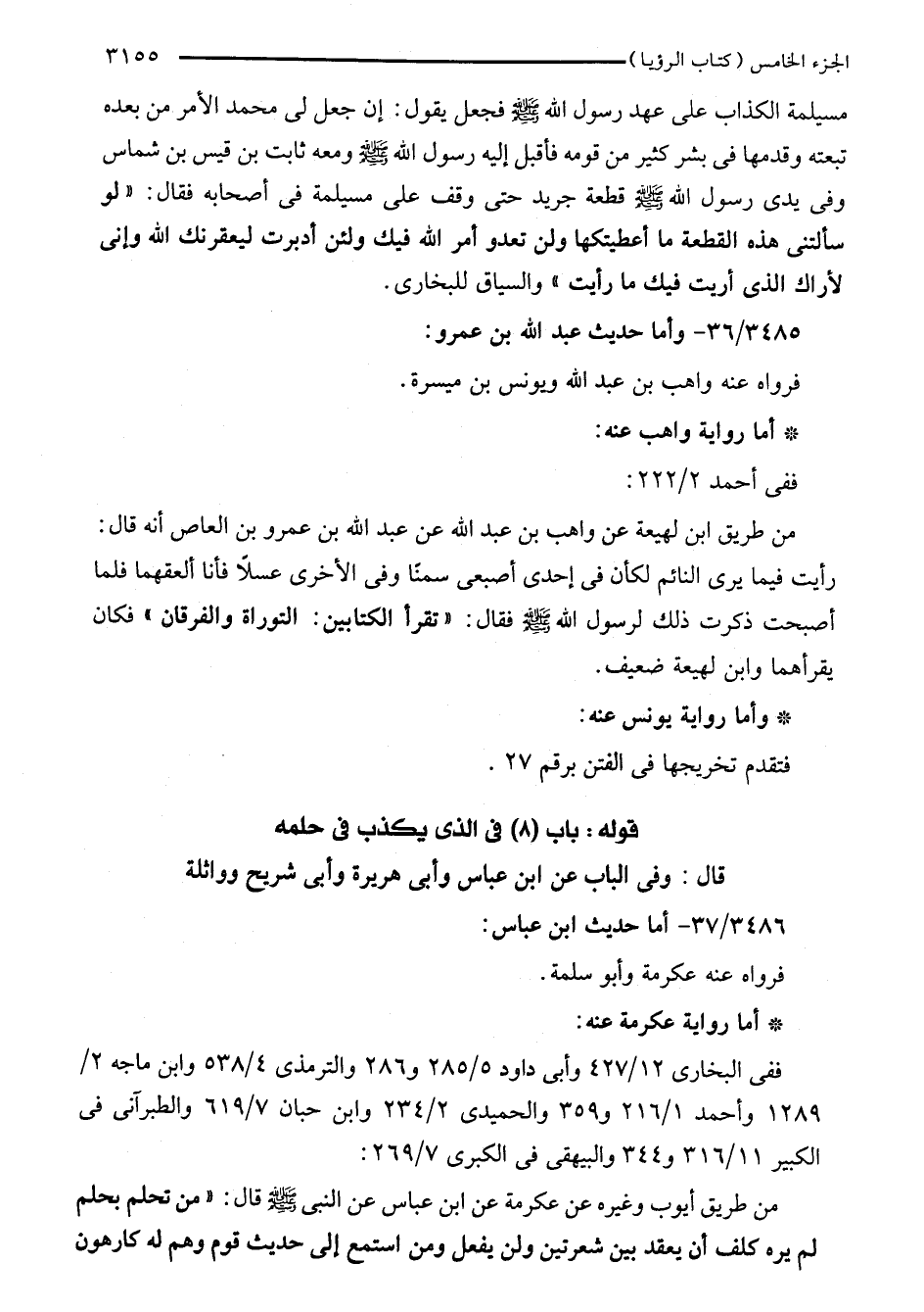 من طريق ابن لهيعة عن واهب بن عبد الله عن عبد الله بن عمرو بن العاص أنه قال: رأيت فيما يرى النائم لكأن في إحدى أصبعى سمنًا وفى الأخرى عسلًا فأنا ألعقهما فلما أصبحت ذكرت ذلك لرسول الله - صلى الله عليه وسلم - فقال: "تقرأ الكتابين: التوراة والفرقان" فكأن يقرأهما وابن لهيعة ضعيف.