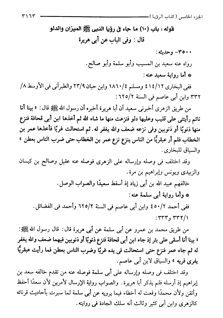 من طريق الزهري أخبرنى سعيد أن أبا هريرة أخبره أن رسول الله - صلى الله عليه وسلم - قال: "بينا أنا نائم رأيتى على قليب وعليها دلو فنزعت منها ما شاء الله ثم أخذها ابن أبى قحافة فنزع منها ذنوبًا أو ذنوبين وفى نزعه ضعف والله يغفر له. ثم استحالت غربًا فأخذها عمر بن الخطاب فلم أر عبقريًّا من الناس ينزع نزع عمر بن الخطاب حتى ضرب الناس بعطن" والسياق للبخاري.