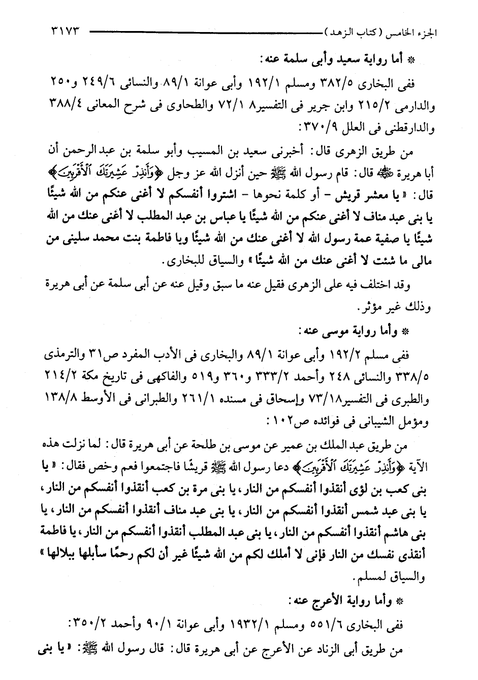 من طريق الزهري قال: أخبرنى سعيد بن المسيب وأبو سلمة بن عبد الرحمن أن أبا هريرة - رضي الله عنه - قال: قام رسول الله - صلى الله عليه وسلم - حين أنزل الله عز وجل {وَأَنْذِرْ عَشِيرَتَكَ الْأَقْرَبِينَ (214)} قال: "يا معشر قريش -أو كلمة نحوها- اشتروا أنفسكم لا أغنى عنكم من الله شيئًا يا بنى عبد مناف لا أغنى عنكم من الله شيئًا يا عباس بن عبد المطلب لا أغنى عنك من الله شيئًا يا صفية عمة رسول الله لا أغنى عنك من الله شيئًا ويا فاطمة بنت محمد سلينى من مالى ما شئت لا أغنى عنك من الله شيئًا" والسياق للبخاري.