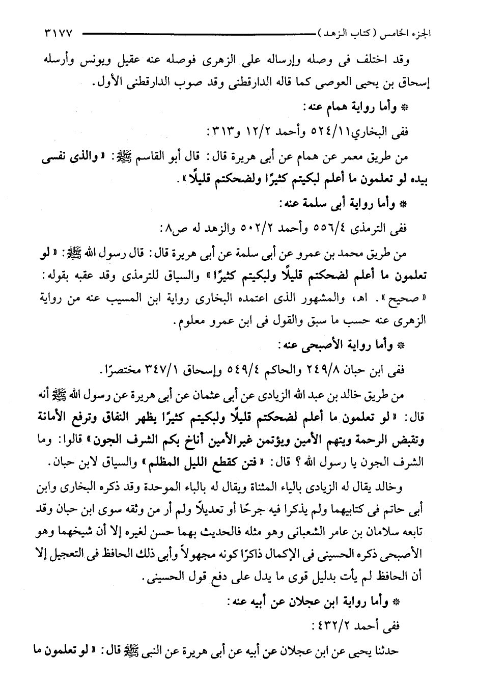 من طريق محمد بن عمرو عن أبى سلمة عن أبى هريرة قال: قال رسول الله - صلى الله عليه وسلم -: "لو تعلمون ما أعلم لضحكتم قليلًا ولبكيتم كثيرًا" والسياق للترمذي وقد عقبه بقوله: "صحيح". اهـ، والمشهور الذي اعتمده البخاري رواية ابن المسيب عنه من رواية الزهري عنه حسب ما سبق والقول في ابن عمرو معلوم.