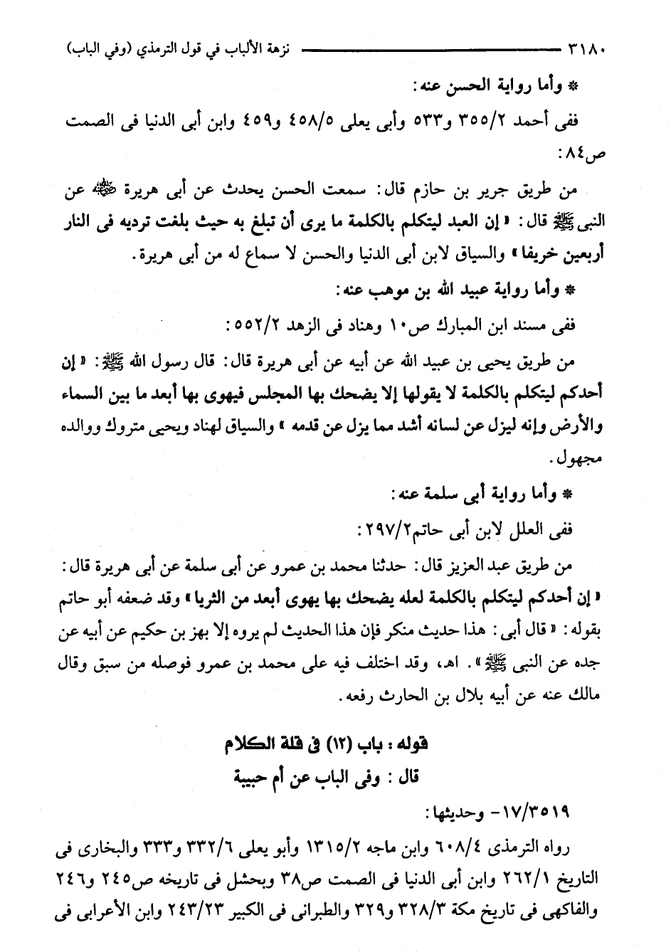 من طريق عبد العزيز قال: حدثنا محمد بن عمرو عن أبى سلمة عن أبى هريرة قال: "إن أحدكم ليتكلم بالكلمة لعله يضحك بها يهوى أبعد من الثريا" وقد ضعفه أبو حاتم بقوله: "قال أبى: هذا حديث منكر فإن هذا الحديث لم يروه إلا بهز بن حكيم عن أبيه عن جده عن النبي - صلى الله عليه وسلم -". اهـ، وقد اختلف فيه على محمد بن عمرو فوصله من سبق وقال مالك عنه عن أبيه بلال بن الحارث رفعه.