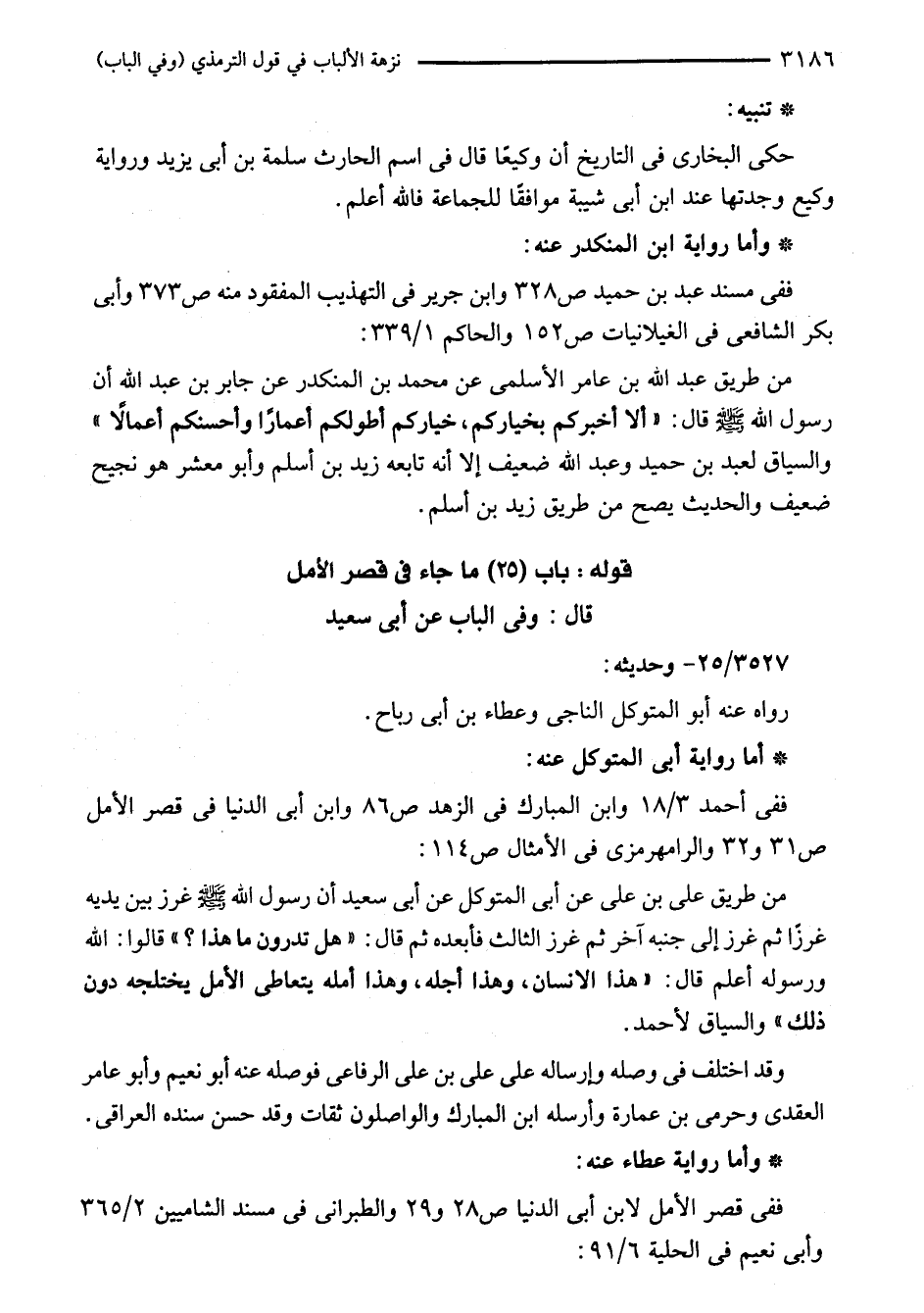 ففي قصر الأمل لابن أبى الدنيا ص 28 و 29 والطبراني في مسند الشاميين 2/ 365 وأبى نعيم في الحلية 6/ 91: