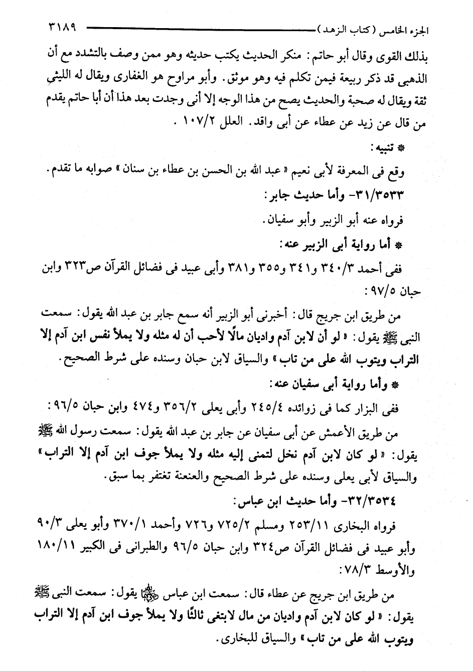 من طريق ابن جريج قال: أخبرنى أبو الزبير أنه سمع جابر بن عبد الله يقول: سمعت النبي - صلى الله عليه وسلم - يقول: "لو أن لابن آدم واديان مالًا لأحب أن له مثله ولا يملأ نفس ابن آدم إلا التراب ويتوب الله على من تاب" والسياق لابن حبان وسنده على شرط الصحيح.