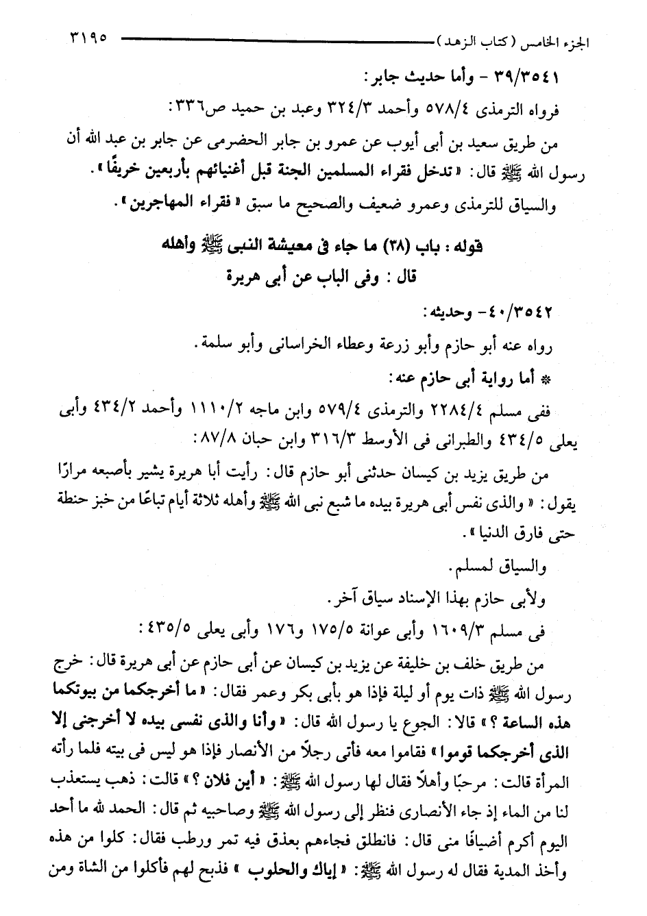 من طريق يزيد بن كيسان حدثنى أبو حازم قال: رأيت أبا هريرة يشير بأصبعه مرارًا يقول: "والذى نفس أبى هريرة بيده ما شبع نبى الله - صلى الله عليه وسلم - وأهله ثلاثة أيام تباعًا من خبز حنطة حتى فارق الدنيا".