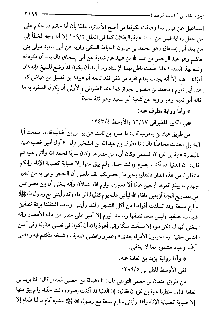 من طريق عباد بن يعقوب قال: نا عمرو بن ثابت عن يونس بن خباب قال: سمعت أبا الخليل يحدث مجاهدًا قال: نا مطرف بن عبد الله بن الشخير قال: "أول أمير خطب علينا بالبصرة عتبة بن غزوان السلمى وكان أول من مصرها وكان سريًّا فحمد الله وأثنى عليه ثم قال: إن الدنيا قد آذنت بصرم وولت حذاء ولم يبق منها إلا صبابة كصبابة الإناء وإنكم منتقلون من هذه الدار فانتقلوا بخير ما بحضرتكم لقد بلغنى أن الحجر يرمى به من شفير جهنم ما يبلغ قعرها أربعين عامًا ألا فعجبتم وايم الله لتملأن وإنه بلغنى أن بين مصراعين من مصاريع الجنة أربعين عامًا والله ليأتين عليه يوم كظيظ الزحام وقد رأيتنى مع رسول الله - صلى الله عليه وسلم - سابع سبعة وقد تسلقت أفواهنا من أكل الشجر ولقد رأيتنى وسعد اشتققنا بردة نصفين فلبست نصفها ولبس سعد نصفها وما منا اليوم إلا أمير على مصر من هذه الأمصار وإنه بلغنى أنها لم تكن نبوة إلا نسخت ملكًا وإنى أعوذ بالله أن أكون في نفسى عظيمًا وفى أعين الناس حقيرًا وستجربون الأمراء بعدى" وعمرو رافضى ضعيف وشيخه متكلم فيه رافضى أيضًا وعباد مشهور بما لا يخفى.