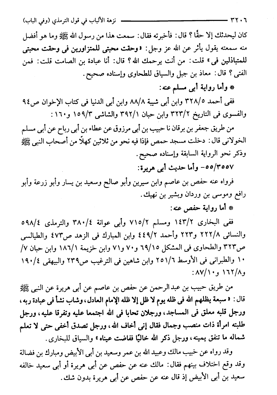 من طريق حبيب بن عبد الرحمن عن حفص بن عاصم عن أبى هريرة عن النبي - صلى الله عليه وسلم - قال: "سبعة يظلهم الله في ظله يوم لا ظل إلا ظله الإمام العادل، وشاب نشأ في عبادة ربه، ورجل قلبه معلق في المساجد، ورجلان تحابا في الله اجتمعا عليه وتفرقا عليه، ورجل طلبته امرأة ذات منصب وجمال فقال إنى أخاف الله، ورجل تصدق أخفى حتى لا تعلم شماله ما تنفق يمينه، ورجل ذكر الله خاليًا ففاضت عيناه" والسياق للبخاري.