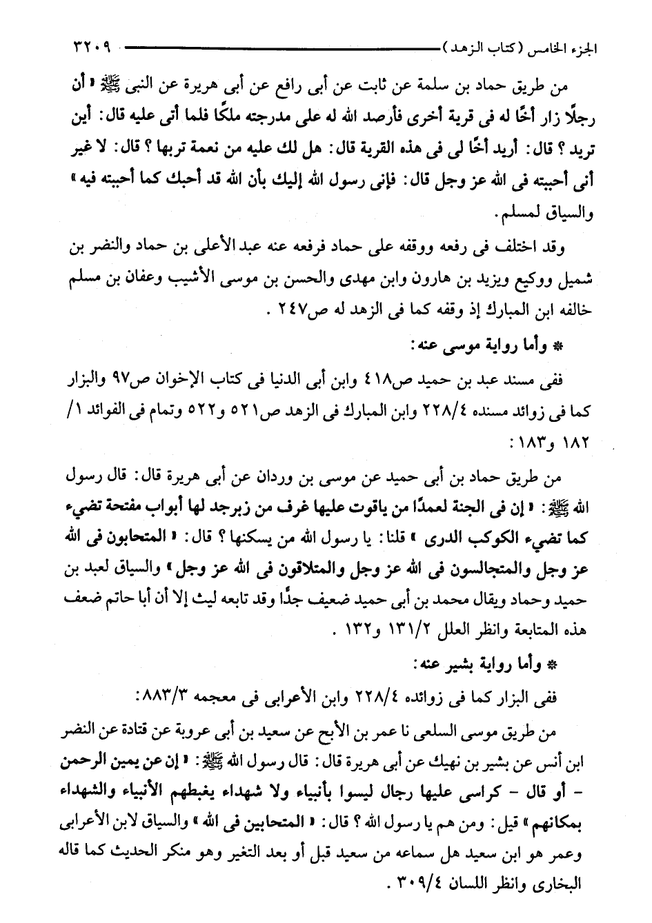 من طريق حماد بن أبى حميد عن موسى بن وردان عن أبى هريرة قال: قال رسول الله - صلى الله عليه وسلم -: "إن في الجنة لعمدًا من ياقوت عليها غرف من زبرجد لها أبواب مفتحة تضيء كما تضيء الكوكب الدرى" قلنا: يا رسول الله من يسكنها؟ قال: "المتحابون في الله عز وجل والمتجالسون في الله عز وجل والمتلاقون في الله عز وجل" والسياق لعبد بن حميد وحماد ويقال محمد بن أبى حميد ضعيف جدًّا وقد تابعه ليث إلا أن أبا حاتم ضعف هذه المتابعة وانظر العلل 2/ 131 و 132.