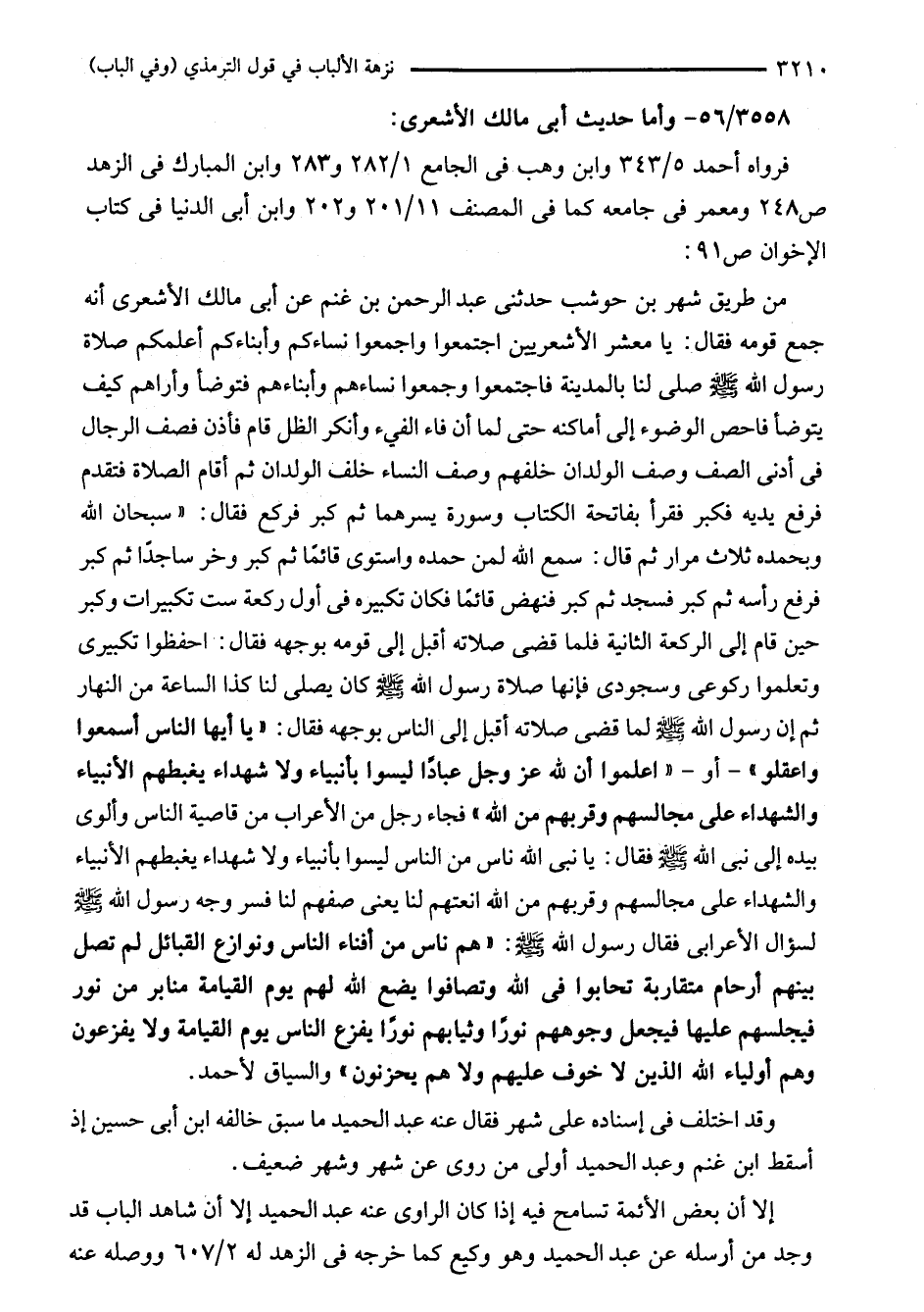 من طريق شهر بن حوشب حدثنى عبد الرحمن بن غنم عن أبى مالك الأشعرى أنه جمع قومه فقال: يا معشر الأشعريين اجتمعوا واجمعوا نساءكم وأبناءكم أعلمكم صلاة رسول الله - صلى الله عليه وسلم - صلى لنا بالمدينة فاجتمعوا وجمعوا نساءهم وأبناءهم فتوضأ وأراهم كيف يتوضأ فاحص الوضوء إلى أماكنه حتى لما أن فاء الفيء وأنكر الظل قام فأذن فصف الرجال في أدنى الصف وصف الولدان خلفهم وصف النساء خلف الولدان ثم أقام الصلاة فتقدم فرفع يديه فكبر فقرأ بفاتحة الكتاب وسورة يسرهما ثم كبر فركع فقال: "سبحان الله وبحمده ثلاث مرار ثم قال: سمع الله لمن حمده واستوى قائمًا ثم كبر وخر ساجدًا ثم كبر فرفع رأسه ثم كبر فسجد ثم كبر فنهض قائمًا فكان تكبيره في أول ركعة ست تكبيرات وكبر حين قام إلى الركعة الثانية فلما قضى صلاته أقبل إلى قومه بوجهه فقال: احفظوا تكبيرى وتعلموا ركوعى وسجودى فإنها صلاة رسول الله - صلى الله عليه وسلم - كان يصلى لنا كذا الساعة من النهار ثم إن رسول الله - صلى الله عليه وسلم - لما قضى صلاته أقبل إلى الناس بوجهه فقال: "يا أيها الناس أسمعوا واعقلو" -أو- "اعلموا أن لله عز وجل عبادًا ليسوا بأنبياء ولا شهداء يغبطهم الأنبياء والشهداء على مجالسهم وقربهم من الله" فجاء رجل من الأعراب من قاصية الناس وألوى بيده إلى نبى الله - صلى الله عليه وسلم - فقال: يا نبى الله ناس من الناس ليسوا بأنبياء ولا شهداء يغبطهم الأنبياء والشهداء على مجالسهم وقربهم من الله انعتهم لنا يعنى صفهم لنا فسر وجه رسول الله - صلى الله عليه وسلم - لسؤال الأعرابي فقال رسول الله - صلى الله عليه وسلم -: "هم ناس من أفناء الناس ونوازع القبائل لم تصل بينهم أرحام متقاربة تحابوا في الله وتصافوا يضع الله لهم يوم القيامة منابر من نور فيجلسهم عليها فيجعل وجوههم نورًا وثيابهم نورًا يفزع الناس يوم القيامة ولا يفزعون وهم أولياء الله الذين لا خوف عليهم ولا هم يحزنون" والسياق لأحمد.