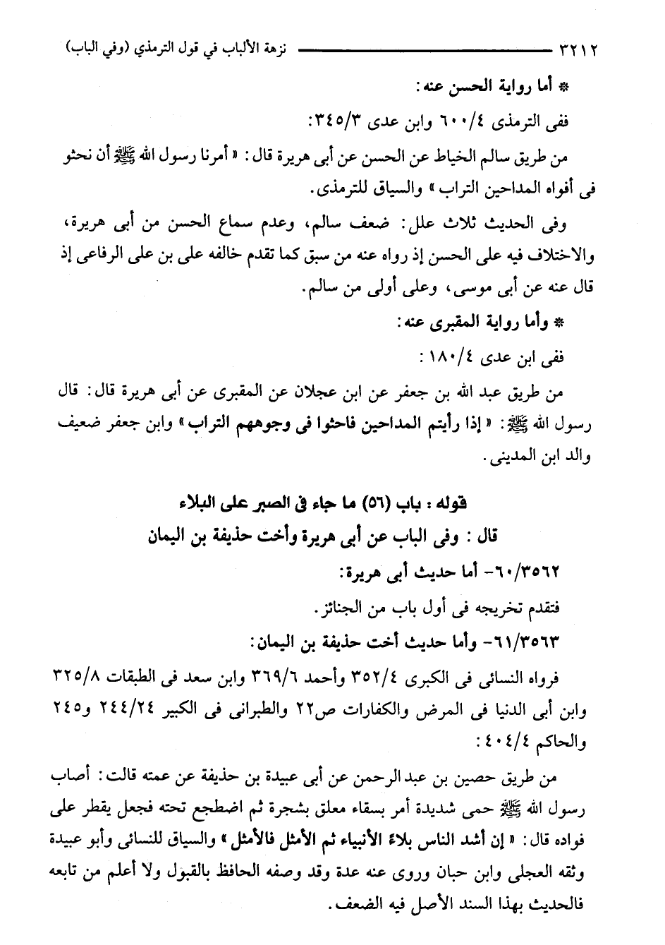 من طريق سالم الخياط عن الحسن عن أبى هريرة قال: "أمرنا رسول الله - صلى الله عليه وسلم - أن نحثو في أفواه المداحين التراب" والسياق لترمذي.