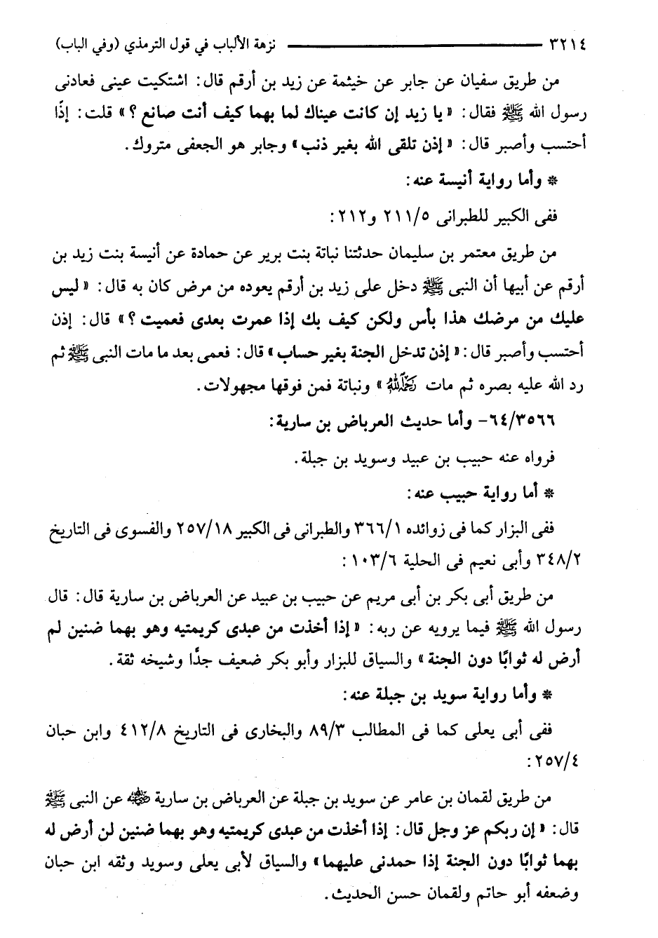 من طريق سفيان عن جابر عن خيثمة عن زيد بن أرقم قال: اشتكيت عينى فعادنى رسول الله - صلى الله عليه وسلم - فقال: "يا زيد إن كانت عيناك لما بهما كيف أنت صانع؟ " قلت: إذا أحتسب وأصبر قال: "إذن تلقى الله بغير ذنب" وجابر هو الجعفى متروك.