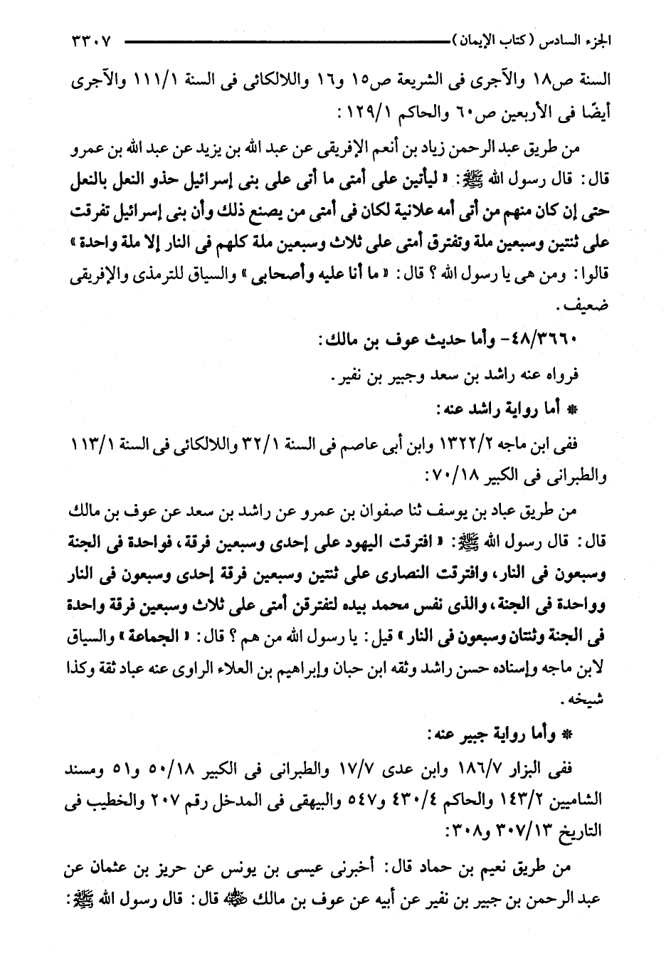 من طريق عباد بن يوسف ثنا صفوان بن عمرو عن راشد بن سعد عن عوف بن مالك قال: قال رسول الله - صلى الله عليه وسلم -: "افترقت اليهود على إحدى وسبعين فرقة، فواحدة في الجنة وسبعون في النار، وافترقت النصارى على ثنتين وسبعين فرقة إحدى وسبعون في النار وواحدة في الجنة، والذى نفس محمد بيده لتفترقن أمتى على ثلاث وسبعين فرقة واحدة في الجنة وثنتان وسبعون في النار" قيل: يا رسول الله من هم؟ قال: "الجماعة" والسياق لابن ماجه وإسناده حسن راشد وثقه ابن حبان وإبراهيم بن العلاء الراوى عنه عباد ثقة وكذا شيخه.