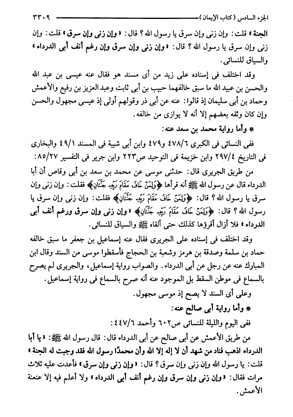 الجنة" قلت: وإن زنى وإن سرق يا رسول الله؟ قال: "وإن زنى وإن سرق" قلت: وإن زنى وإن سرق يا رسول الله؟ قال: "وإن زنى وإن سرق وإن رغم أنف أبى الدرداء" والسياق للنسائي.