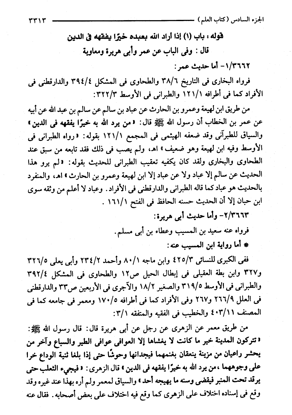 من طريق ابن لهيعة وعمرو بن الحارث عن عباد بن سالم عن سالم بن عبد الله عن أبيه عن عمر بن الخطاب أن رسول الله - صلى الله عليه وسلم - قال: "من يرد الله به خيرًا يفقهه في الدين" والسياق للطبراني وقد ضعفه الهيثمى في المجمع 1/ 121 بقوله: "رواه الطبراني في الأوسط وفيه ابن لهيعة وهو ضعيف" اهـ، ولم يصب في ذلك فقد تابعه من سبق عند الطحاوى والبخاري ولقد كان يكفيه تعقيب الطبراني للحديث بقوله: "لم يرو هذا الحديث عن سالم إلا عباد ولا عن عباد إلا ابن لهيعة وعمرو بن الحارث" اهـ، والمنفرد بالحديث هو عباد كما قاله الطبراني والدارقطني في الأفراد. وعباد لا أعلم من وثقه سوى ابن حبان إلا أن الحديث حسنه الحافظ في الفتح 1/ 161.