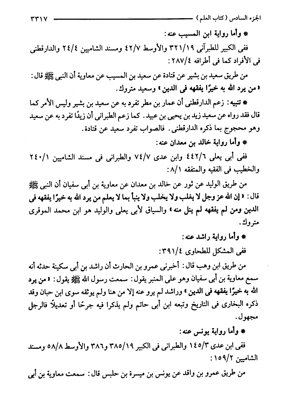 من طريق ابن وهب قال: أخبرنى عمرو بن الحارث أن راشد بن أبى سكينة حدثه أنه سمع معاوية بن أبى سفيان وهو على المنبر يفول: سمعت رسول الله - صلى الله عليه وسلم - يقول: "من يرد الله به خيرًا يفقهه في الدين" وراشد لم يرو عنه إلا من هنا ولم يوثقه سوى ابن حبان وقد ذكره البخاري في التاريخ وتبعه ابن أبى حاتم ولم يذكرا فيه جرحًا أو تعديلًا فالرجل مجهول.