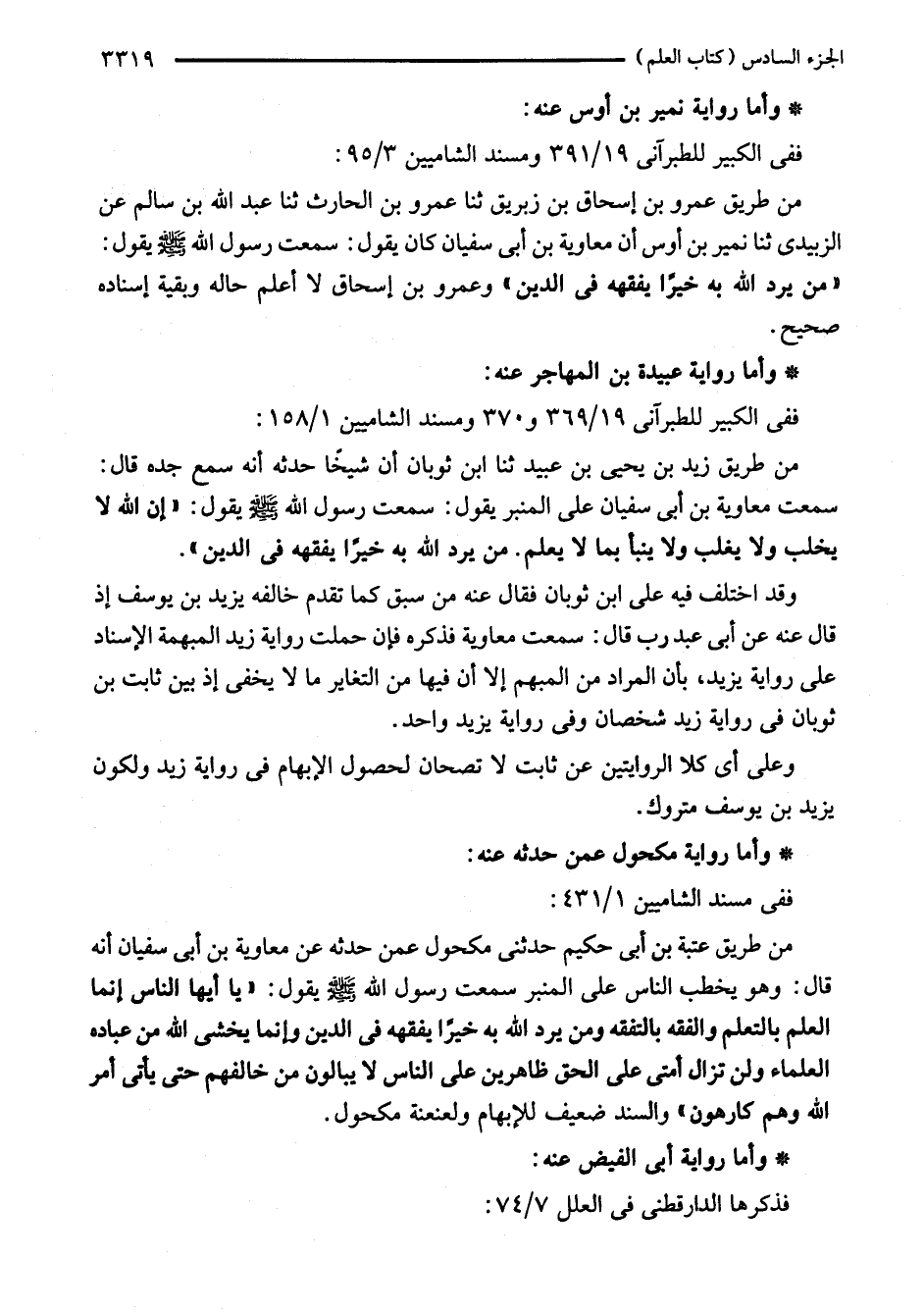 من طريق عتبة بن أبى حكيم حدثنى مكحول عمن حدثه عن معاوية بن أبى سفيان أنه قال: وهو يخطب الناس على المنبر سمعت رسول الله - صلى الله عليه وسلم - يقول: "يا أيها الناس إنما العلم بالتعلم والفقه بالتفقه ومن يرد الله به خيرًا يفقهه في الدين وإنما يخشى الله من عباده العلماء ولن تزال أمتى على الحق ظاهرين على الناس لا يبالون من خالفهم حتى يأتى أمر الله وهم كارهون" والسند ضعيف للإبهام ولعنعنة مكحول.