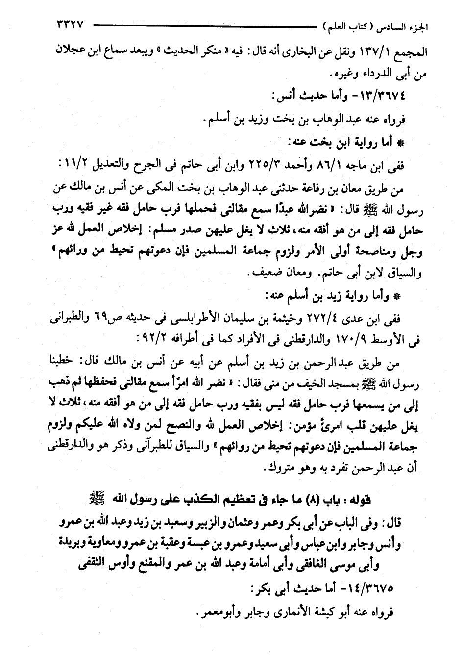 من طريق معان بن رفاعة حدثنى عبد الوهاب بن بخت المكى عن أنس بن مالك عن رسول الله - صلى الله عليه وسلم - قال: "نضر الله عبدًا سمع مقالتى فحملها فرب حامل فقه غير فقيه ورب حامل فقه إلى من هو أفقه منه، ثلاث لا يغل عليهن صدر مسلم: إخلاص العمل لله عز وجل ومناصحة أولى الأمر ولزوم جماعة المسلمين فإن دعوتهم تحيط من ورائهم" والسياق لابن أبى حاتم. ومعان ضعيف.