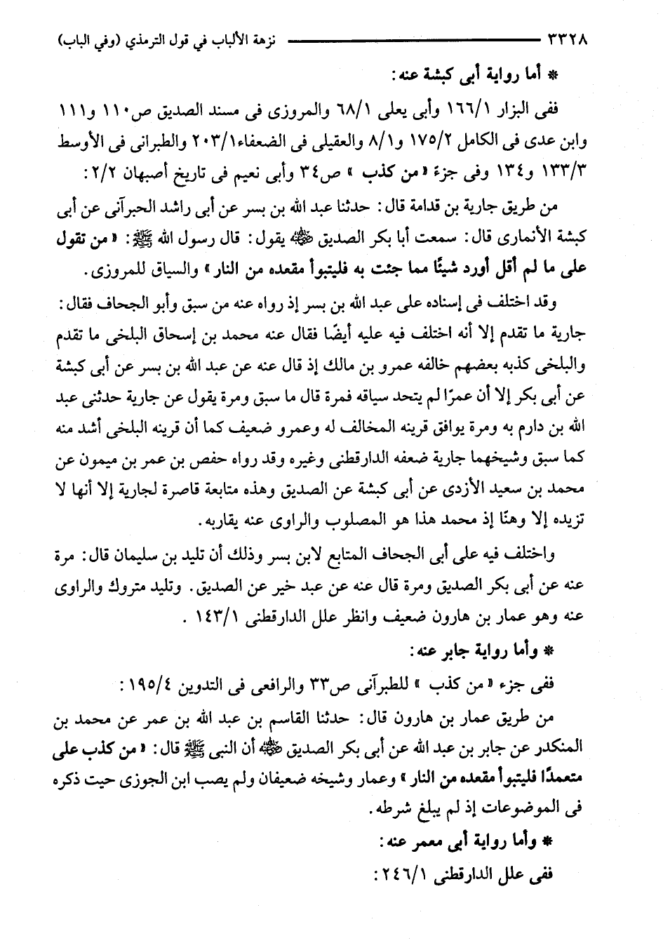 من طريق جارية بن قدامة قال: حدثنا عبد الله بن بسر عن أبى راشد الحبرانى عن أبى كبشة الأنمارى قال: سمعت أبا بكر الصديق - رضي الله عنه - يقول: قال رسول الله - صلى الله عليه وسلم -: "من تقول على ما لم أقل أورد شيئًا مما جئت به فليتبوأ مقعده من النار" والسياق للمروزى.