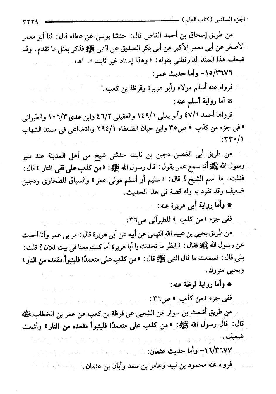 من طريق يحيى بن عبيد الله التيمى عن أبيه عن أبى هريرة قال: مر بى عمر وأنا أحدث عن رسول الله - صلى الله عليه وسلم - فقال: "انظر ما تحدث يا أبا هريرة أما كنت معنا في بيت فلان؟ قلت: بلى قال: فسمعت ما قال النبي - صلى الله عليه وسلم - قال: "من كذب على متعمدًا فليتبوأ مقعده من النار" ويحيى متروك.
