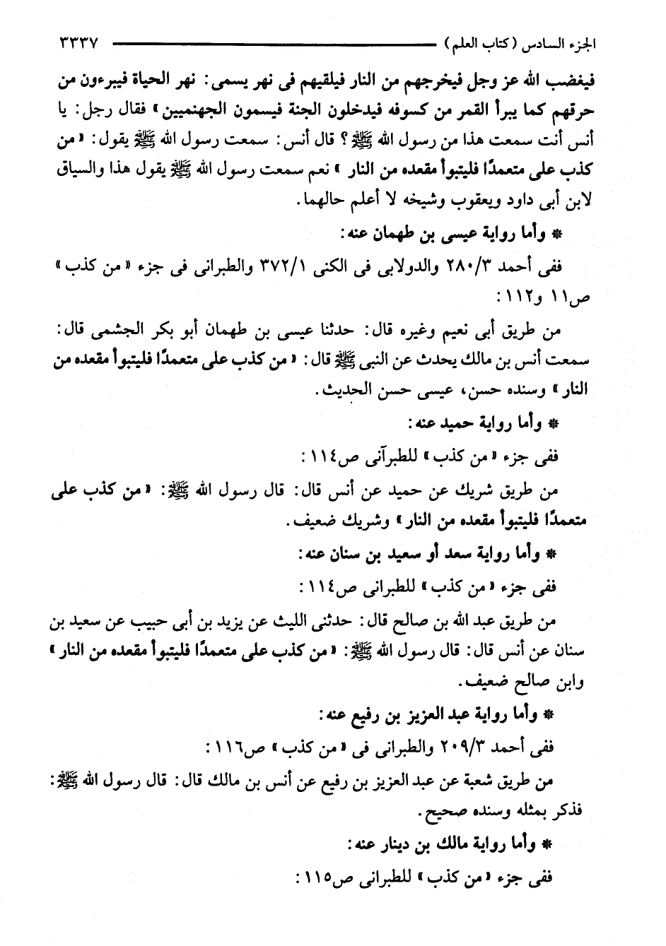 فيغضب الله عز وجل فيخرجهم من النار فيلقيهم في نهر يسمى: نهر الحياة فيبرءون من حرقهم كما يبرأ القمر من كسوفه فيدخلون الجنة فيسمون الجهنميين" فقال رجل: يا أنس أنت سمعت هذا من رسول الله - صلى الله عليه وسلم -؟ قال أنس: سمعت رسول الله - صلى الله عليه وسلم - يقول: "من كذب على متعمدًا فليتبوأ مقعده من النار" نعم سمعت رسول الله - صلى الله عليه وسلم - يقول هذا والسياق لابن أبى داود ويعقوب وشيخه لا أعلم حالهما.