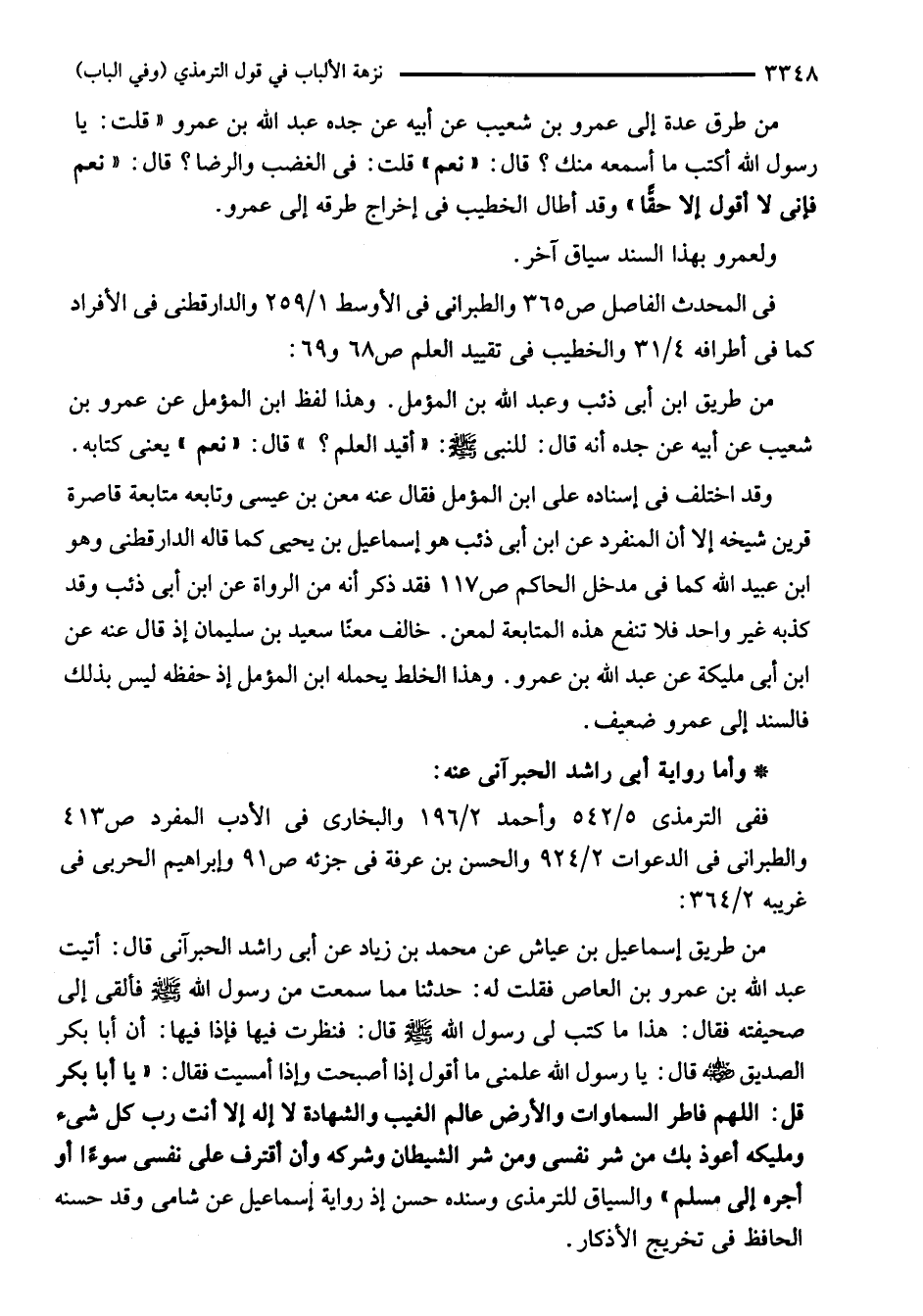 من طريق إسماعيل بن عياش عن محمد بن زياد عن أبى راشد الحبرآنى قال: أتيت عبد الله بن عمرو بن العاص فقلت له: حدثنا مما سمعت من رسول الله - صلى الله عليه وسلم - فألقى إلى صحيفته فقال: هذا ما كتب لى رسول الله - صلى الله عليه وسلم - قال: فنظرت فيها فإذا فيها: أن أبا بكر الصديق - رضي الله عنه - قال: يا رسول الله علمنى ما أقول إذا أصبحت وإذا أمسيت فقال: "يا أبا بكر قل: اللهم فاطر السماوات والأرض عالم الغيب والشهادة لا إله إلا أنت رب كل شىء ومليكه أعوذ بك من شر نفسى ومن شر الشيطان وشركه وأن أقترف على نفسى سوءًا أو أجره إلى مسلم" والسياق للترمذي وسنده حسن إذ رواية إسماعيل عن شامى وقد حسنه الحافظ في تخريج الأذكار.