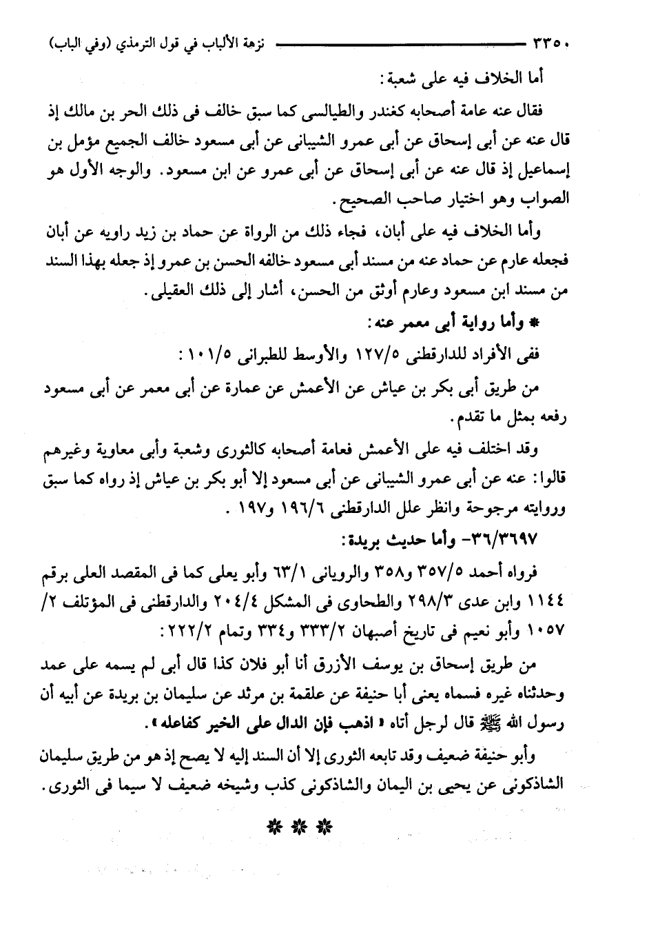 فقال عنه عامة أصحابه كغندر والطيالسى كما سبق خالف في ذلك الحر بن مالك إذ قال عنه عن أبى إسحاق عن أبى عمرو الشيبانى عن أبى مسعود خالف الجميع مؤمل بن إسماعيل إذ قال عنه عن أبى إسحاق عن أبى عمرو عن ابن مسعود. والوجه الأول هو الصواب وهو اختيار صاحب الصحيح.