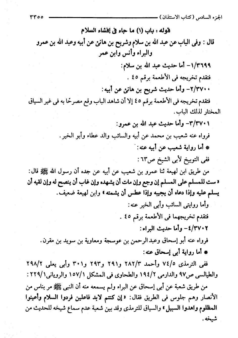 قال: وفى الباب عن عبد الله بن سلام وشريح بن هانئ عن أبيه وعبد الله بن عمرو والبراء وأنس وابن عمر