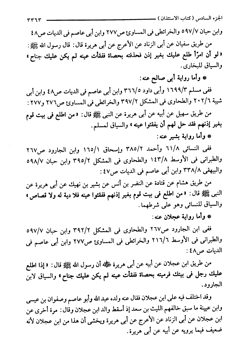 من طريق ابن عجلان عن أبيه عن أبى هريرة - رضي الله عنه - أن رسول الله - صلى الله عليه وسلم - قال: "إذا اطلع عليك رجل في بيتك فرميته بحصاة ففقأت عينه لم يكن عليك جناح" والسياق لابن الجارود.