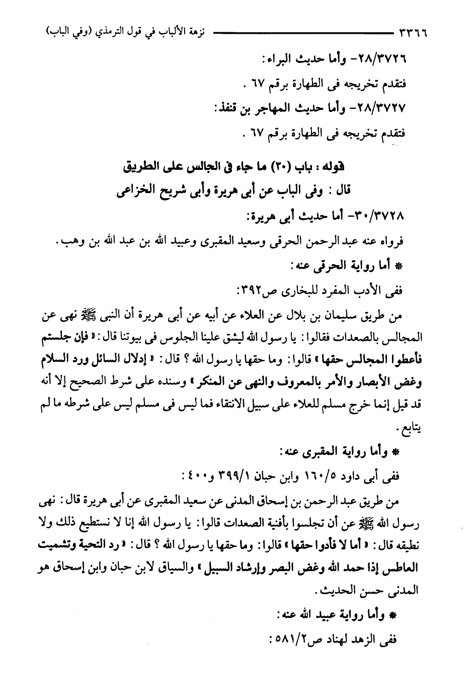 من طريق عبد الرحمن بن إسحاق المدنى عن سعيد المقبرى عن أبى هريرة قال: نهى رسول الله - صلى الله عليه وسلم - عن أن تجلسوا بأفنية الصعدات قالوا: يا رسول الله إنا لا نستطيع ذلك ولا نطيقه قال: "أما لا فأدوا حقها" قالوا: وما حقها يا رسول الله؟ قال: "رد التحية وتشميت العاطس إذا حمد الله وغض البصر وإرشاد السبيل" والسياق لابن حبان وابن إسحاق هو المدنى حسن الحديث.