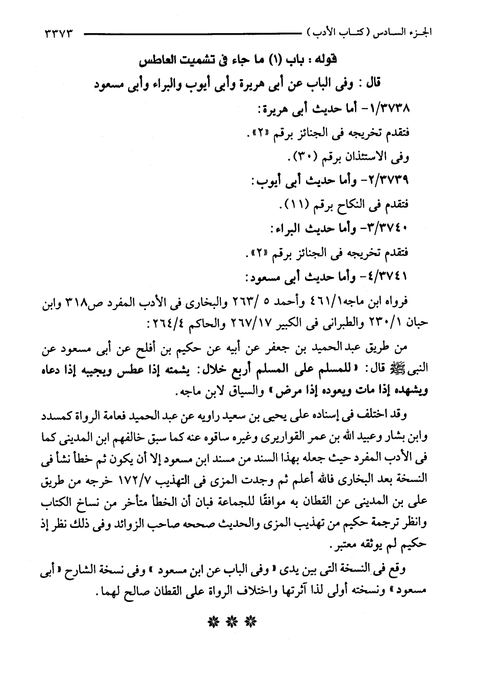 من طريق عبد الحميد بن جعفر عن أبيه عن حكيم بن أفلح عن أبى مسعود عن النبي - صلى الله عليه وسلم - قال: "للمسلم على المسلم أربع خلال: يشمته إذا عطس ويجيبه إذا دعاه ويشهده إذا مات ويعوده إذا مرض" والسياق لابن ماجه.