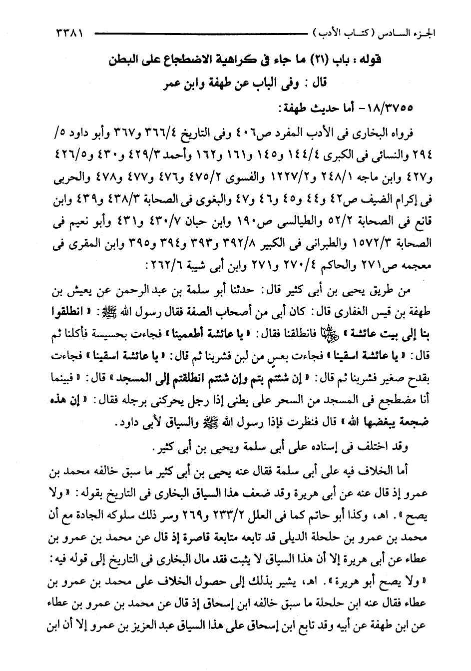 من طريق يحيى بن أبى كثير قال: حدثنا أبو سلمة بن عبد الرحمن عن يعيش بن طهفة بن قيس الغفارى قال: كان أبى من أصحاب الصفة فقال رسول الله - صلى الله عليه وسلم -: "انطلقوا بنا إلى بيت عائشة" - رضي الله عنها - فانطلقنا فقال: "يا عائشة أطعمينا" فجاءت بحسيسة فأكلنا ثم قال: "يا عائشة اسقينا" فجاءت بعسٍ من لبن فشربنا ثم قال: "يا عائشة اسقينا" فجاءت بقدح صغير فشربنا ثم قال: "إن شئتم يتم وإن شئتم انطلقتم إلى المسجد" قال: "فبينما أنا مضطجع في المسجد من السحر على بطنى إذا رجل يحركنى برجله فقال: "إن هذه ضجعة يبغضها الله" قال فنظرت فإذا رسول الله - صلى الله عليه وسلم - والسياق لأبى داود.