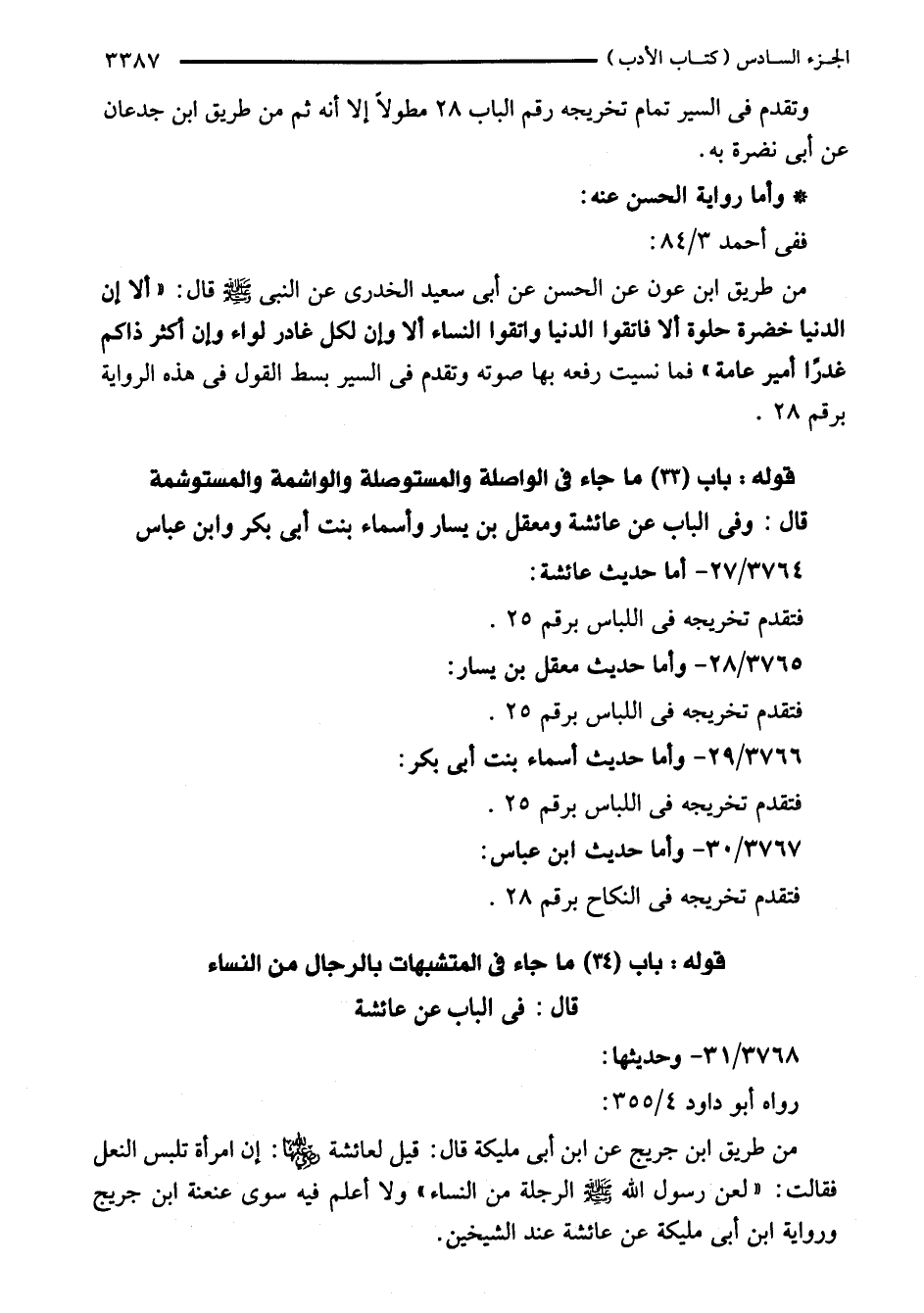 من طريق ابن جريج عن ابن أبى مليكة قال: قيل لعائشة - رضي الله عنها -: إن امرأة تلبس النعل فقالت: "لعن رسول الله - صلى الله عليه وسلم - الرجلة من النساء" ولا أعلم فيه سوى عنعنة ابن جريج ورواية ابن أبى مليكة عن عائشة عند الشيخين.