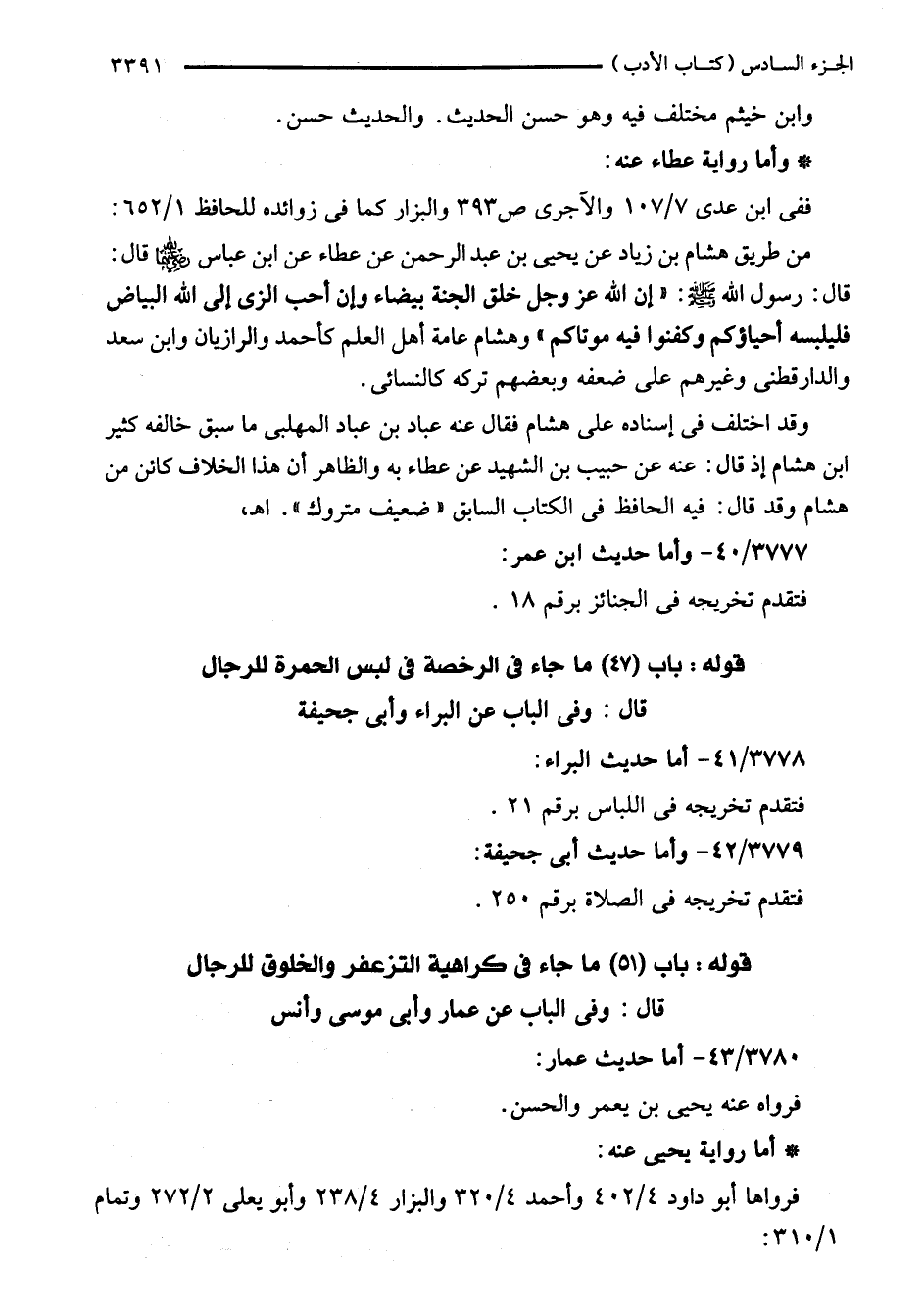 من طريق هشام بن زياد عن يحيى بن عبد الرحمن عن عطاء عن ابن عباس - رضي الله عنهما - قال: قال: رسول الله - صلى الله عليه وسلم -: "إن الله عز وجل خلق الجنة بيضاء وإن أحب الزى إلى الله البياض فليلبسه أحياؤكم وكفنوا فيه موتاكم" وهشام عامة أهل العلم كأحمد والرازيان وابن سعد والدارقطني وغيرهم على ضعفه وبعضهم تركه كالنسائي.