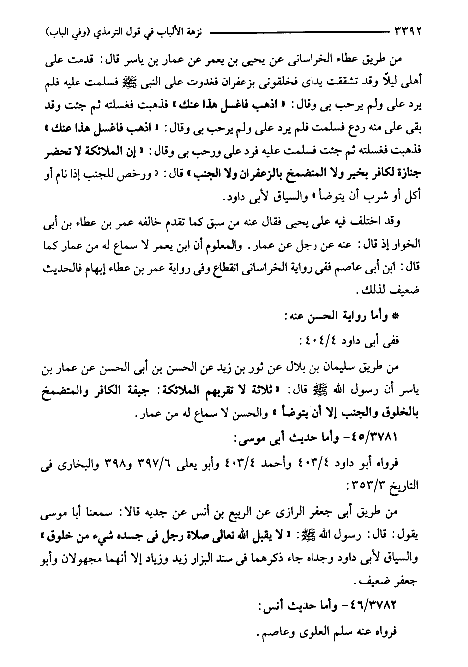 من طريق عطاء الخراسانى عن يحيى بن يعمر عن عمار بن ياسر قال: قدمت على أهلى ليلًا وقد تشققت يداى فخلقونى بزعفران فغدوت على النبي - صلى الله عليه وسلم - فسلمت عليه فلم يرد على ولم يرحب بى وقال: "اذهب فاغسل هذا عنك" فذهبت فغسلته ثم جئت وقد بقى على منه ردع فسلمت فلم يرد على ولم يرحب بى وقال: "اذهب فاغسل هذا عنك" فذهبت فغسلته ثم جئت فسلمت عليه فرد على ورحب بى وقال: "إن الملائكة لا تحضر جنازة لكافر بخير ولا المتضمخ بالزعفران ولا الجنب" قال: "ورخص للجنب إذا نام أو أكل أو شرب أن يتوضأ" والسياق لأبى داود.