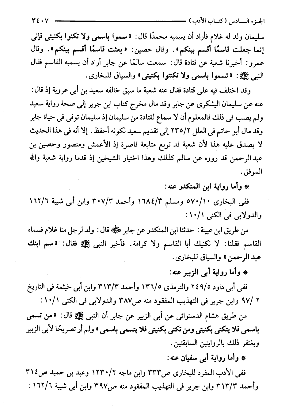 سليمان ولد له غلام فأراد أن يسميه محمدًا قال: "سموا باسمى ولا تكنوا بكنيتى فإنى إنما جعلت قاسمًا أقسم بينكم". وقال حصين: "بعثت قاسمًا أقسم بينكم". وقال عمرو: أخبرنا شعبة عن قتادة قال: سمعت سالمًا عن جابر أراد أن يسميه القاسم فقال النبي - صلى الله عليه وسلم -: "تسموا باسمى ولا تكتنوا بكنيتى" والسياق للبخاري.