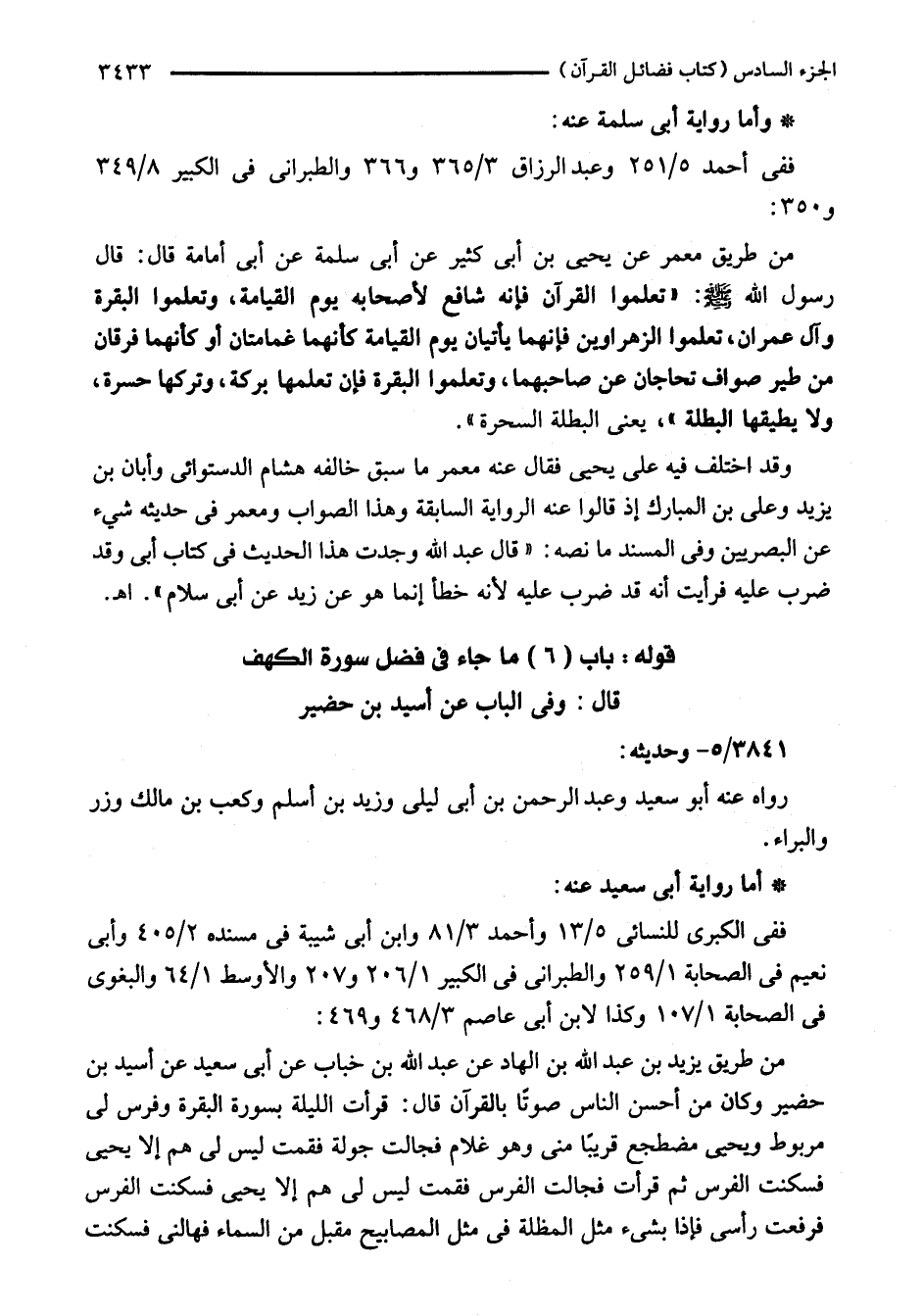 من طريق معمر عن يحيى بن أبى كثير عن أبى سلمة عن أبى أمامة قال: قال رسول الله - صلى الله عليه وسلم -: "تعلموا القرآن فإنه شافع لأصحابه يوم القيامة، وتعلموا البقرة وآل عمران، تعلموا الزهراوين فإنهما يأتيان يوم القيامة كأنهما غمامتان أو كأنهما فرقان من طير صواف تحاجان عن صاحبهما، وتعلموا البقرة فإن تعلمها بركة، وتركها حسرة، ولا يطيقها البطلة"، يعنى البطلة السحرة".