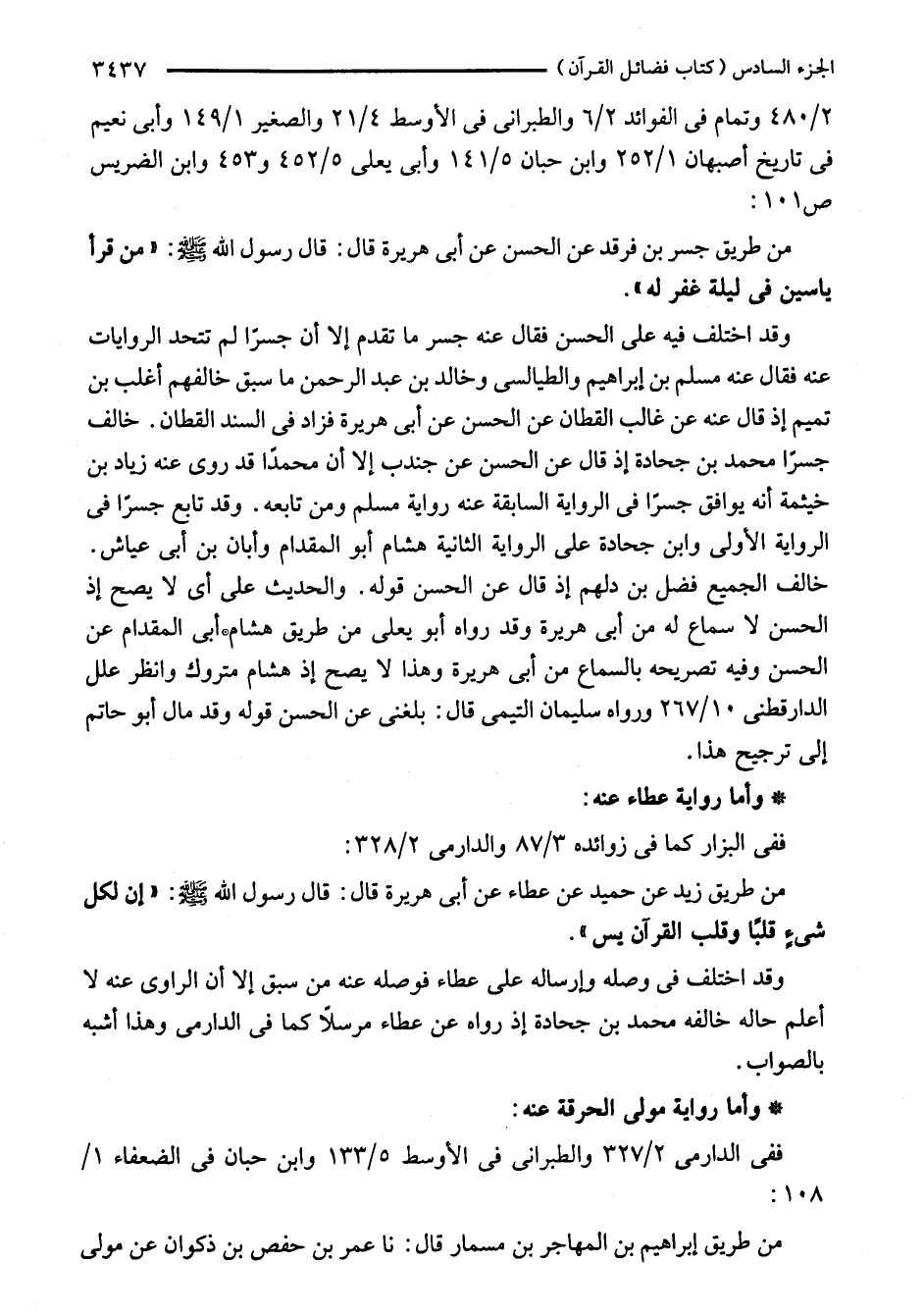 وقد اختلف فيه على الحسن فقال عنه جسر ما تقدم إلا أن جسرًا لم تتحد الروايات عنه فقال عنه مسلم بن إبراهيم والطيالسى وخالد بن عبد الرحمن ما سبق خالفهم أغلب بن تميم إذ قال عنه عن غالب القطان عن الحسن عن أبى هريرة فزاد في السند القطان. خالف جسرًا محمد بن جحادة إذ قال عن الحسن عن جندب إلا أن محمدًا قد روى عنه زياد بن خيثمة أنه يوافق جسرًا في الرواية السابقة عنه رواية مسلم ومن تابعه. وقد تابع جسرًا في الرواية الأولى وابن جحادة على الرواية الثانية هشام أبو المقدام وأبان بن أبى عياش. خالف الجميع فضل بن دلهم إذ قال عن الحسن قوله. والحديث على أي لا يصح إذ الحسن لا سماع له من أبى هريرة وقد رواه أبو يعلى من طريق هشام أبى المقدام عن الحسن وفيه تصريحه بالسماع من أبى هريرة وهذا لا يصح إذ هشام متروك وانظر علل الدارقطني 10/ 267 ورواه سليمان التيمى قال: بلغنى عن الحسن قوله وقد مال أبو حاتم إلى ترجيح هذا.