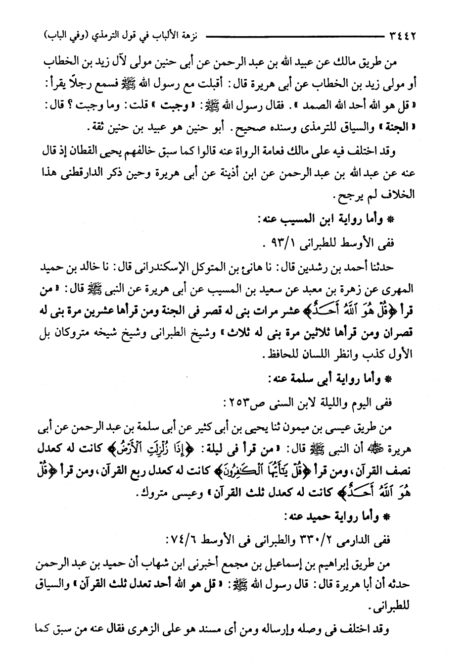 من طريق مالك عن عبيد الله بن عبد الرحمن عن أبى حنين مولى لآل زيد بن الخطاب أو مولى زيد بن الخطاب عن أبى هريرة قال: أقبلت مع رسول الله - صلى الله عليه وسلم - فسمع رجلًا يقرأ: "قل هو الله أحد الله الصمد". فقال رسول الله - صلى الله عليه وسلم -: "وجبت" قلت: وما وجبت؟ قال: "الجنة" والسياق للترمذي وسنده صحيح. أبو حنين هو عبيد بن حنين ثقة.
