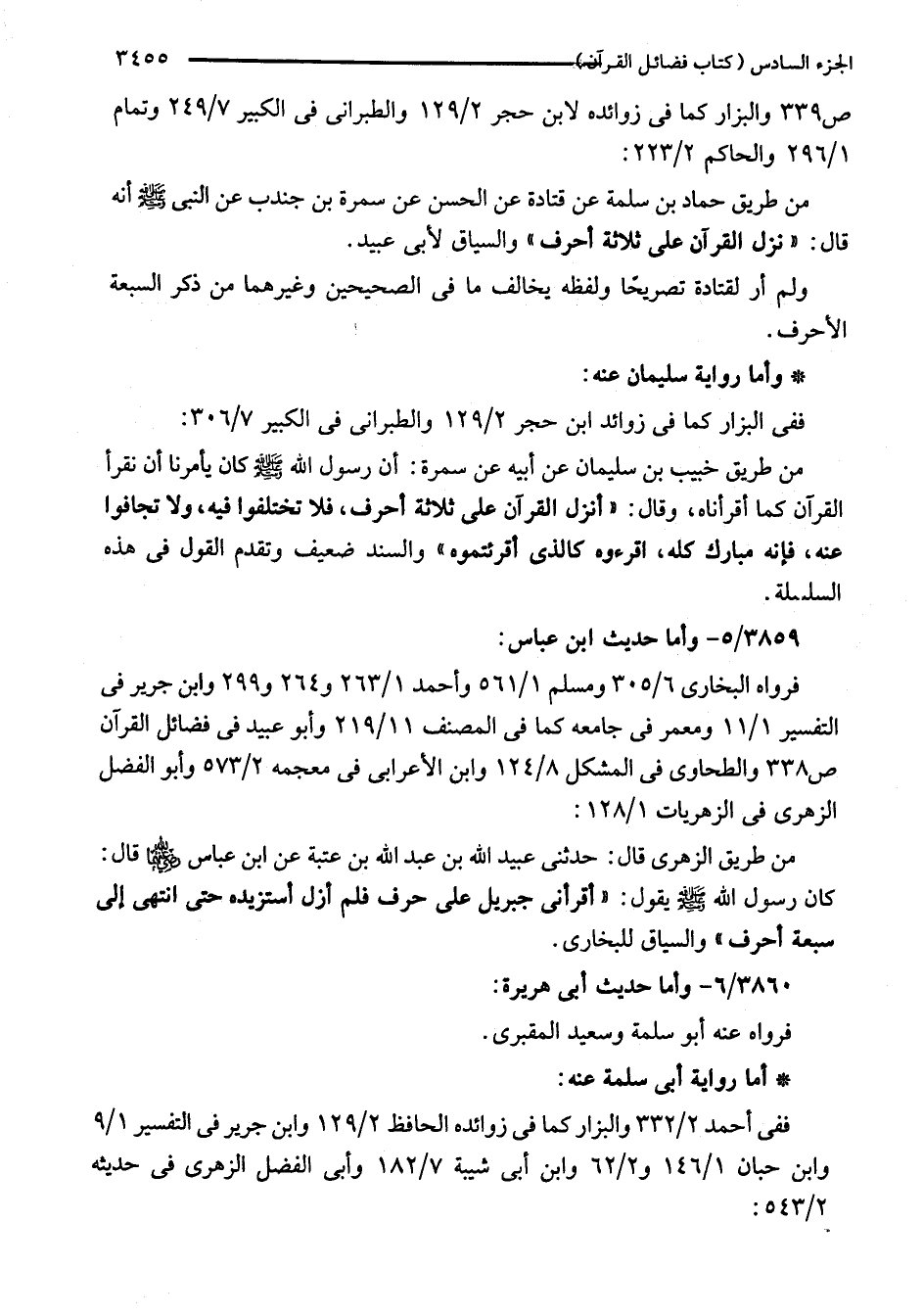 من طريق حماد بن سلمة عن قتادة عن الحسن عن سمرة بن جندب عن النبي - صلى الله عليه وسلم - أنَّه قال: "نزل القرآن على ثلاثة أحرف" والسياق لأبي عبيد.