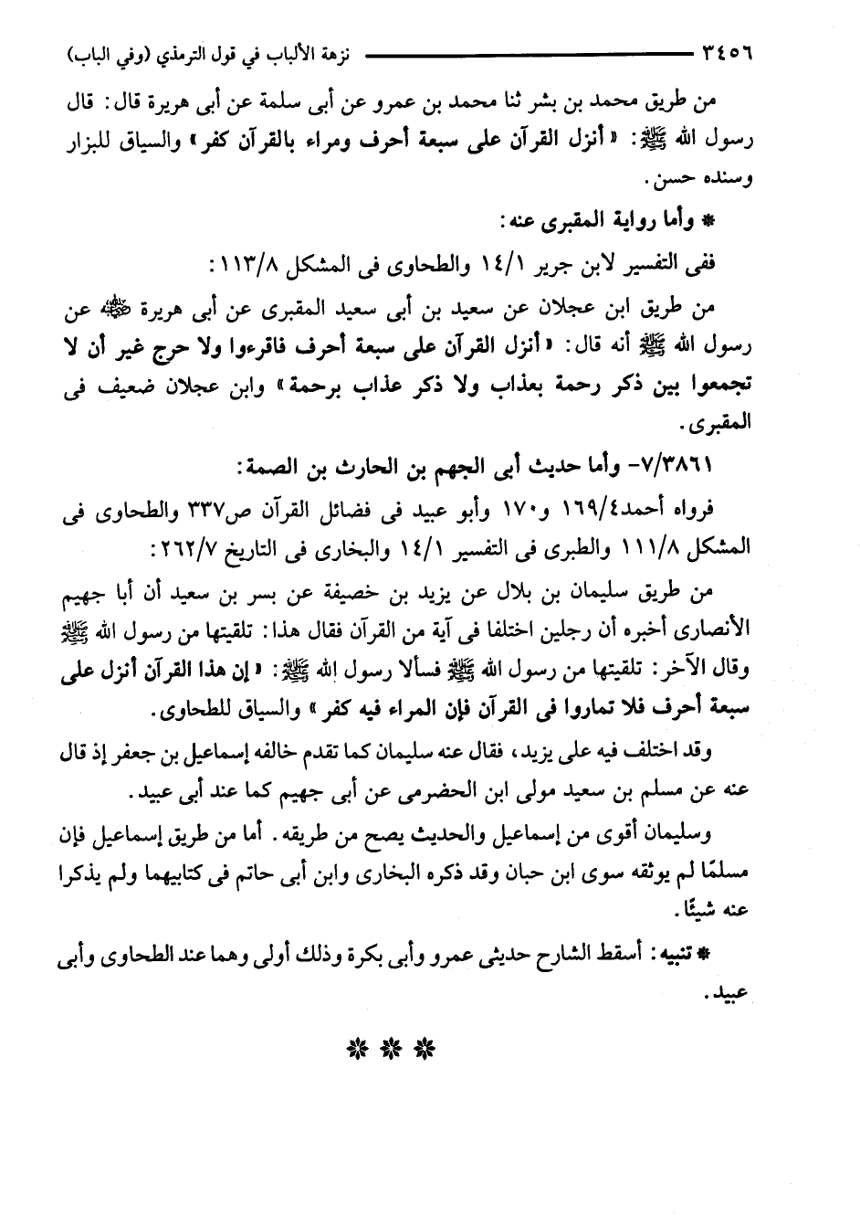 من طريق سليمان بن بلال عن يزيد بن خصيفة عن بسر بن سعيد أن أَبا جهيم الأَنْصَارِيّ أخبره أن رجلين اختلفا في آية من القرآن فقال هذا: تلقيتها من رسول الله - صلى الله عليه وسلم - وقال الآخر: تلقيتها من رسول الله - صلى الله عليه وسلم - فسألا رسول الله - صلى الله عليه وسلم - "إن هذا القرآن أنزل على سبعة أحرف فلا تماروا في القرآن فإن المراء فيه كفر" والسياق للطحاوي.