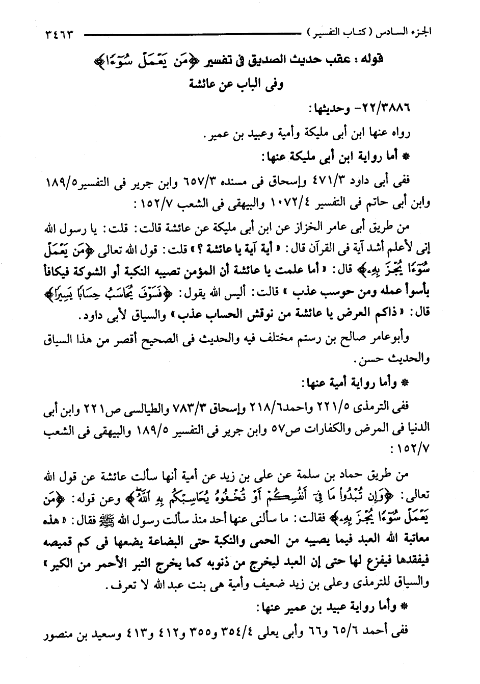 من طريق أبي عامر الخزاز عن ابن أبي مليكة عن عائشة قالت: قلت: يَا رسول الله إنِّي لأعلم أشد آية في القرآن قال: "أية آية يا عائشة؟ " قلت: قول الله تعالى {مَنْ يَعْمَلْ سُوءًا يُجْزَ بِهِ} قال: "أما علمت يَا عائشة أن المؤمن تصيبه النكبة أو الشوكة فيكافأ بأسوأ عمله ومن حوسب عذب" قالت: أليس الله يقول: {فَسَوْفَ يُحَاسَبُ حِسَابًا يَسِيرًا} قال: "ذاكم العرض يَا عائشة من نوقش الحساب عذب" والسياق لأبي داود.