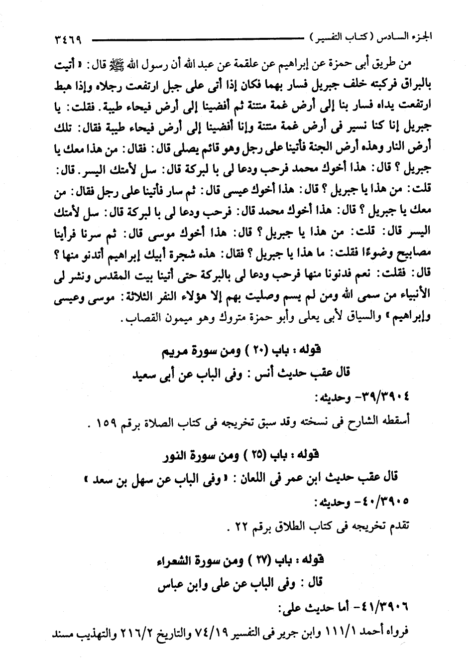 من طريق أبي حمزة عن إبراهيم عن علقمة عن عبد الله أن رسول الله - صلى الله عليه وسلم - قال: "أتيت بالبراق فركبته خلف جبريل فسار بهما فكان إذا أتى على جبل ارتفعت رجلاه وإذا هبط ارتفعت يداه فسار بنا إلى أرض غمة منتنة ثم أفضينا إلى أرض فيحاء طيبة. فقلت: يَا جبريل إنا كنا نسير في أرض غمة منتنة وإنا أفضينا إلى أرض فيحاء طيبة فقال: تلك أرض النَّار وهذه أرض الجنة فأتينا على رجل وهو قائم يصلي قال: فقال: من هذا معك يَا جبريل؟ قال: هذا أخوك محمَّد فرحب ودعا لي بالبركة قال: سل لأمتك اليسر. قال: قلت: من هذا يَا جبريل؟ قال: هذا أخوك عيسى قال: ثم سار فأتينا على رجل فقال: من معك يَا جبريل؟ قال: هذا أخوك محمَّد قال: فرحب ودعا لي بالبركة قال: سل لأمتك اليسر قال: قلت: من هذا يَا جبريل؟ قال: هذا أخوك موسى قال: ثم سرنا فرأينا مصابيح وضوءًا فقلت: ما هذا يَا جبريل؟ فقال: هذه شجرة أبيك إبراهيم أتدنو منها؟ قال: فقلت: نعم فدنونا منها فرحب ودعا لي بالبركة حتَّى أتينا بيت المقدس ونشر لي الأنبياء من سمى الله ومن لم يسم وصليت بهم إلَّا هؤلاء النفر الثلاثة: موسى وعيسى وإبراهيم" والسياق لأبي يعلى وأبو حمزة متروك وهو ميمون القصاب.